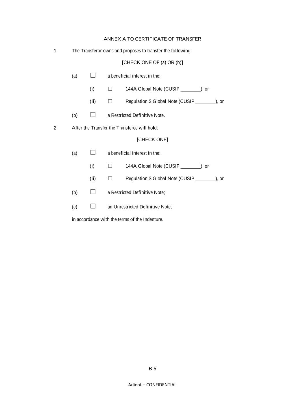 B-5 Adient – CONFIDENTIAL ANNEX A TO CERTIFICATE OF TRANSFER 1. The Transferor owns and proposes to transfer the following: [CHECK ONE OF (a) OR (b)] (a) ☐ a beneficial interest in the: (i) ☐ 144A Global Note (CUSIP ________), or (ii) ☐ Regulation S Global Note (CUSIP ________), or (b) ☐ a Restricted Definitive Note. 2. After the Transfer the Transferee will hold: [CHECK ONE] (a) ☐ a beneficial interest in the: (i) ☐ 144A Global Note (CUSIP ________), or (ii) ☐ Regulation S Global Note (CUSIP ________), or (b) ☐ a Restricted Definitive Note; (c) ☐ an Unrestricted Definitive Note; in accordance with the terms of the Indenture.