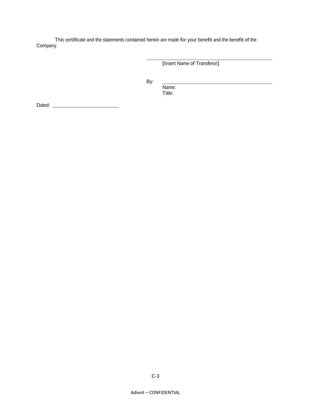 C-3 Adient – CONFIDENTIAL This certificate and the statements contained herein are made for your benefit and the benefit of the Company. [Insert Name of Transferor] By: Name: Title: Dated: