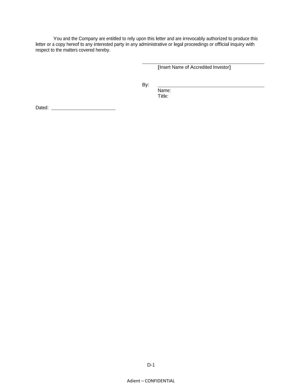 D-1 Adient – CONFIDENTIAL You and the Company are entitled to rely upon this letter and are irrevocably authorized to produce this letter or a copy hereof to any interested party in any administrative or legal proceedings or official inquiry with respect to the matters covered hereby. [Insert Name of Accredited Investor] By: Name: Title: Dated: