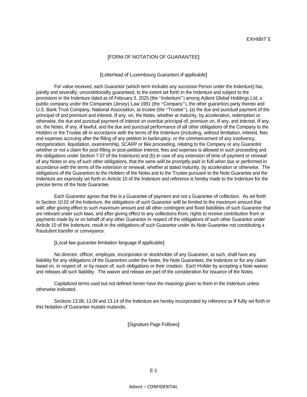 E-1 Adient – CONFIDENTIAL EXHIBIT E [FORM OF NOTATION OF GUARANTEE] [Letterhead of Luxembourg Guarantors if applicable] For value received, each Guarantor (which term includes any successor Person under the Indenture) has, jointly and severally, unconditionally guaranteed, to the extent set forth in the Indenture and subject to the provisions in the Indenture dated as of February 3, 2025 (the “Indenture”) among Adient Global Holdings Ltd, a public company under the Companies (Jersey) Law 1991 (the “Company”), the other guarantors party thereto and U.S. Bank Trust Company, National Association, as trustee (the “Trustee”), (a) the due and punctual payment of the principal of and premium and interest, if any, on, the Notes, whether at maturity, by acceleration, redemption or otherwise, the due and punctual payment of interest on overdue principal of, premium on, if any, and interest, if any, on, the Notes, if any, if lawful, and the due and punctual performance of all other obligations of the Company to the Holders or the Trustee all in accordance with the terms of the Indenture (including, without limitation, interest, fees and expenses accruing after the filing of any petition in bankruptcy, or the commencement of any insolvency, reorganization, liquidation, examinership, SCARP or like proceeding, relating to the Company or any Guarantor whether or not a claim for post-filing or post-petition interest, fees and expenses is allowed in such proceeding and the obligations under Section 7.07 of the Indenture) and (b) in case of any extension of time of payment or renewal of any Notes or any of such other obligations, that the same will be promptly paid in full when due or performed in accordance with the terms of the extension or renewal, whether at stated maturity, by acceleration or otherwise. The obligations of the Guarantors to the Holders of the Notes and to the Trustee pursuant to the Note Guarantee and the Indenture are expressly set forth in Article 10 of the Indenture and reference is hereby made to the Indenture for the precise terms of the Note Guarantee. Each Guarantor agrees that this is a Guarantee of payment and not a Guarantee of collection. As set forth in Section 10.02 of the Indenture, the obligations of such Guarantor will be limited to the maximum amount that will, after giving effect to such maximum amount and all other contingent and fixed liabilities of such Guarantor that are relevant under such laws, and after giving effect to any collections from, rights to receive contribution from or payments made by or on behalf of any other Guarantor in respect of the obligations of such other Guarantor under Article 10 of the Indenture, result in the obligations of such Guarantor under its Note Guarantee not constituting a fraudulent transfer or conveyance. [Local law guarantee limitation language if applicable] No director, officer, employee, incorporator or stockholder of any Guarantor, as such, shall have any liability for any obligations of the Guarantors under the Notes, the Note Guarantees, the Indenture or for any claim based on, in respect of, or by reason of, such obligations or their creation. Each Holder by accepting a Note waives and releases all such liability. The waiver and release are part of the consideration for issuance of the Notes. Capitalized terms used but not defined herein have the meanings given to them in the Indenture unless otherwise indicated. Sections 13.08, 13.09 and 13.14 of the Indenture are hereby incorporated by reference as if fully set forth in this Notation of Guarantee mutatis mutandis. [Signature Page Follows]