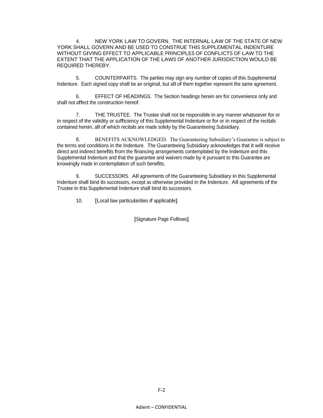F-2 Adient – CONFIDENTIAL 4. NEW YORK LAW TO GOVERN. THE INTERNAL LAW OF THE STATE OF NEW YORK SHALL GOVERN AND BE USED TO CONSTRUE THIS SUPPLEMENTAL INDENTURE WITHOUT GIVING EFFECT TO APPLICABLE PRINCIPLES OF CONFLICTS OF LAW TO THE EXTENT THAT THE APPLICATION OF THE LAWS OF ANOTHER JURISDICTION WOULD BE REQUIRED THEREBY. 5. COUNTERPARTS. The parties may sign any number of copies of this Supplemental Indenture. Each signed copy shall be an original, but all of them together represent the same agreement. 6. EFFECT OF HEADINGS. The Section headings herein are for convenience only and shall not affect the construction hereof. 7. THE TRUSTEE. The Trustee shall not be responsible in any manner whatsoever for or in respect of the validity or sufficiency of this Supplemental Indenture or for or in respect of the recitals contained herein, all of which recitals are made solely by the Guaranteeing Subsidiary. 8. BENEFITS ACKNOWLEDGED. The Guaranteeing Subsidiary’s Guarantee is subject to the terms and conditions in the Indenture. The Guaranteeing Subsidiary acknowledges that it will receive direct and indirect benefits from the financing arrangements contemplated by the Indenture and this Supplemental Indenture and that the guarantee and waivers made by it pursuant to this Guarantee are knowingly made in contemplation of such benefits. 9. SUCCESSORS. All agreements of the Guaranteeing Subsidiary in this Supplemental Indenture shall bind its successors, except as otherwise provided in the Indenture. All agreements of the Trustee in this Supplemental Indenture shall bind its successors. 10. [Local law particularities if applicable]. [Signature Page Follows]