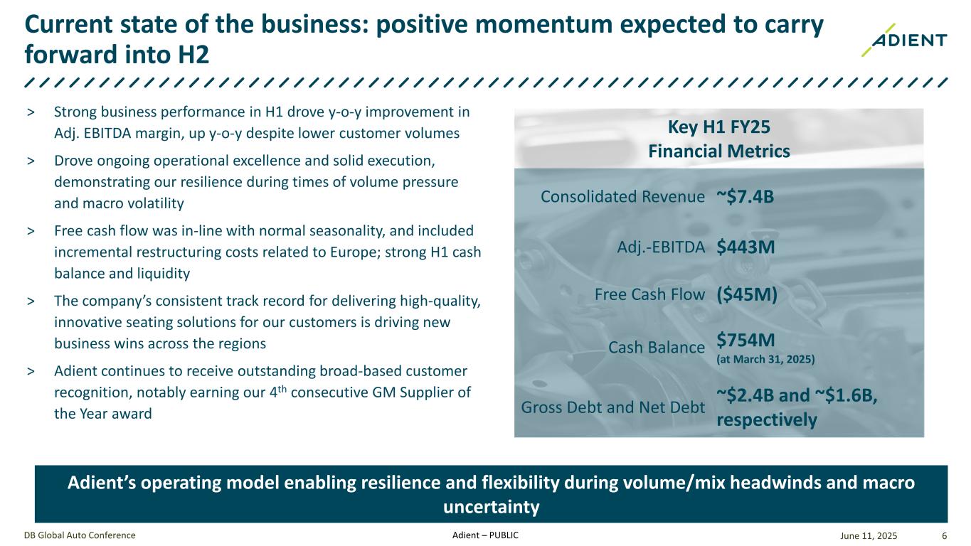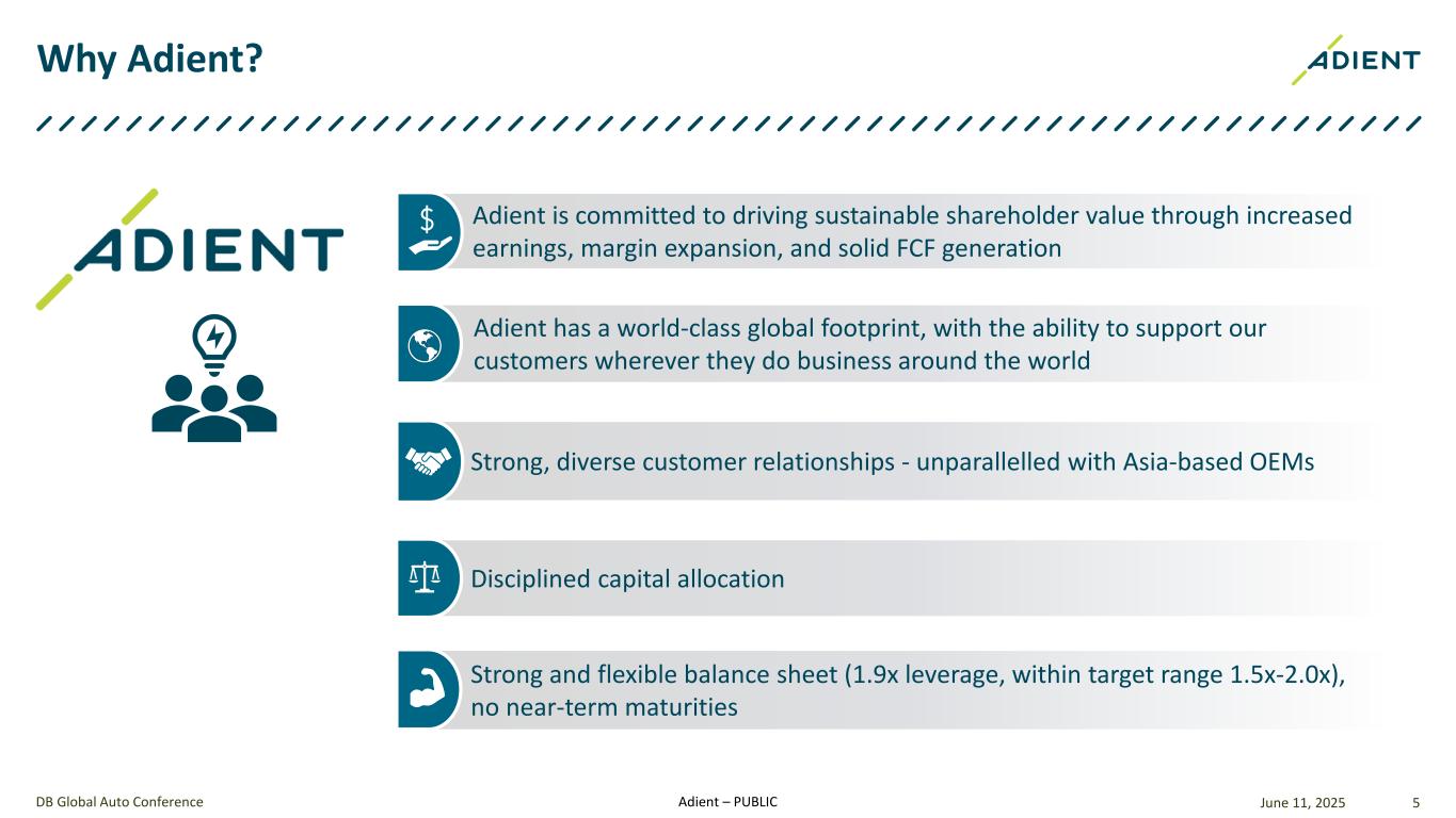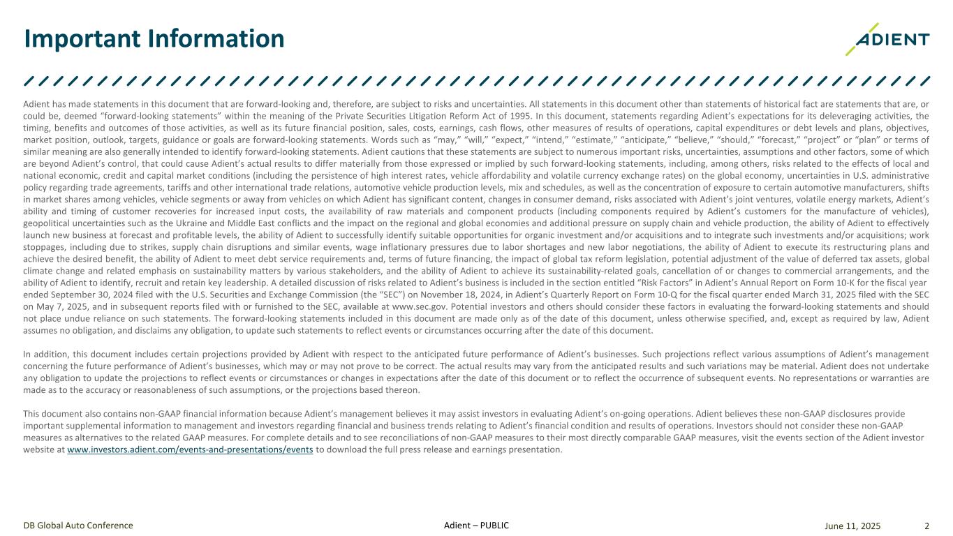 Adient – PUBLIC Important Information Adient has made statements in this document that are forward-looking and, therefore, are subject to risks and uncertainties. All statements in this document other than statements of historical fact are statements that are, or could be, deemed “forward-looking statements” within the meaning of the Private Securities Litigation Reform Act of 1995. In this document, statements regarding Adient’s expectations for its deleveraging activities, the timing, benefits and outcomes of those activities, as well as its future financial position, sales, costs, earnings, cash flows, other measures of results of operations, capital expenditures or debt levels and plans, objectives, market position, outlook, targets, guidance or goals are forward-looking statements. Words such as “may,” “will,” “expect,” “intend,” “estimate,” “anticipate,” “believe,” “should,” “forecast,” “project” or “plan” or terms of similar meaning are also generally intended to identify forward-looking statements. Adient cautions that these statements are subject to numerous important risks, uncertainties, assumptions and other factors, some of which are beyond Adient’s control, that could cause Adient’s actual results to differ materially from those expressed or implied by such forward-looking statements, including, among others, risks related to the effects of local and national economic, credit and capital market conditions (including the persistence of high interest rates, vehicle affordability and volatile currency exchange rates) on the global economy, uncertainties in U.S. administrative policy regarding trade agreements, tariffs and other international trade relations, automotive vehicle production levels, mix and schedules, as well as the concentration of exposure to certain automotive manufacturers, shifts in market shares among vehicles, vehicle segments or away from vehicles on which Adient has significant content, changes in consumer demand, risks associated with Adient’s joint ventures, volatile energy markets, Adient’s ability and timing of customer recoveries for increased input costs, the availability of raw materials and component products (including components required by Adient’s customers for the manufacture of vehicles), geopolitical uncertainties such as the Ukraine and Middle East conflicts and the impact on the regional and global economies and additional pressure on supply chain and vehicle production, the ability of Adient to effectively launch new business at forecast and profitable levels, the ability of Adient to successfully identify suitable opportunities for organic investment and/or acquisitions and to integrate such investments and/or acquisitions; work stoppages, including due to strikes, supply chain disruptions and similar events, wage inflationary pressures due to labor shortages and new labor negotiations, the ability of Adient to execute its restructuring plans and achieve the desired benefit, the ability of Adient to meet debt service requirements and, terms of future financing, the impact of global tax reform legislation, potential adjustment of the value of deferred tax assets, global climate change and related emphasis on sustainability matters by various stakeholders, and the ability of Adient to achieve its sustainability-related goals, cancellation of or changes to commercial arrangements, and the ability of Adient to identify, recruit and retain key leadership. A detailed discussion of risks related to Adient’s business is included in the section entitled “Risk Factors” in Adient’s Annual Report on Form 10-K for the fiscal year ended September 30, 2024 filed with the U.S. Securities and Exchange Commission (the “SEC”) on November 18, 2024, in Adient’s Quarterly Report on Form 10-Q for the fiscal quarter ended March 31, 2025 filed with the SEC on May 7, 2025, and in subsequent reports filed with or furnished to the SEC, available at www.sec.gov. Potential investors and others should consider these factors in evaluating the forward-looking statements and should not place undue reliance on such statements. The forward-looking statements included in this document are made only as of the date of this document, unless otherwise specified, and, except as required by law, Adient assumes no obligation, and disclaims any obligation, to update such statements to reflect events or circumstances occurring after the date of this document. In addition, this document includes certain projections provided by Adient with respect to the anticipated future performance of Adient’s businesses. Such projections reflect various assumptions of Adient’s management concerning the future performance of Adient’s businesses, which may or may not prove to be correct. The actual results may vary from the anticipated results and such variations may be material. Adient does not undertake any obligation to update the projections to reflect events or circumstances or changes in expectations after the date of this document or to reflect the occurrence of subsequent events. No representations or warranties are made as to the accuracy or reasonableness of such assumptions, or the projections based thereon. This document also contains non-GAAP financial information because Adient’s management believes it may assist investors in evaluating Adient’s on-going operations. Adient believes these non-GAAP disclosures provide important supplemental information to management and investors regarding financial and business trends relating to Adient’s financial condition and results of operations. Investors should not consider these non-GAAP measures as alternatives to the related GAAP measures. For complete details and to see reconciliations of non-GAAP measures to their most directly comparable GAAP measures, visit the events section of the Adient investor website at www.investors.adient.com/events-and-present