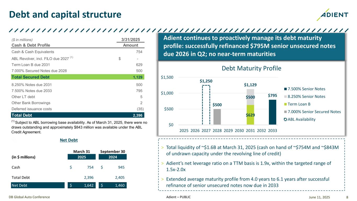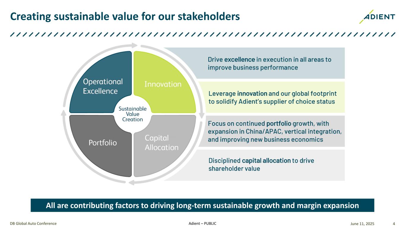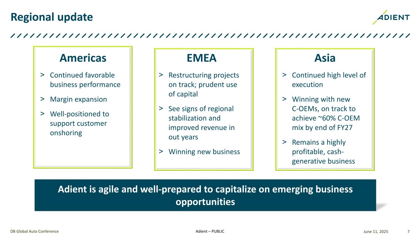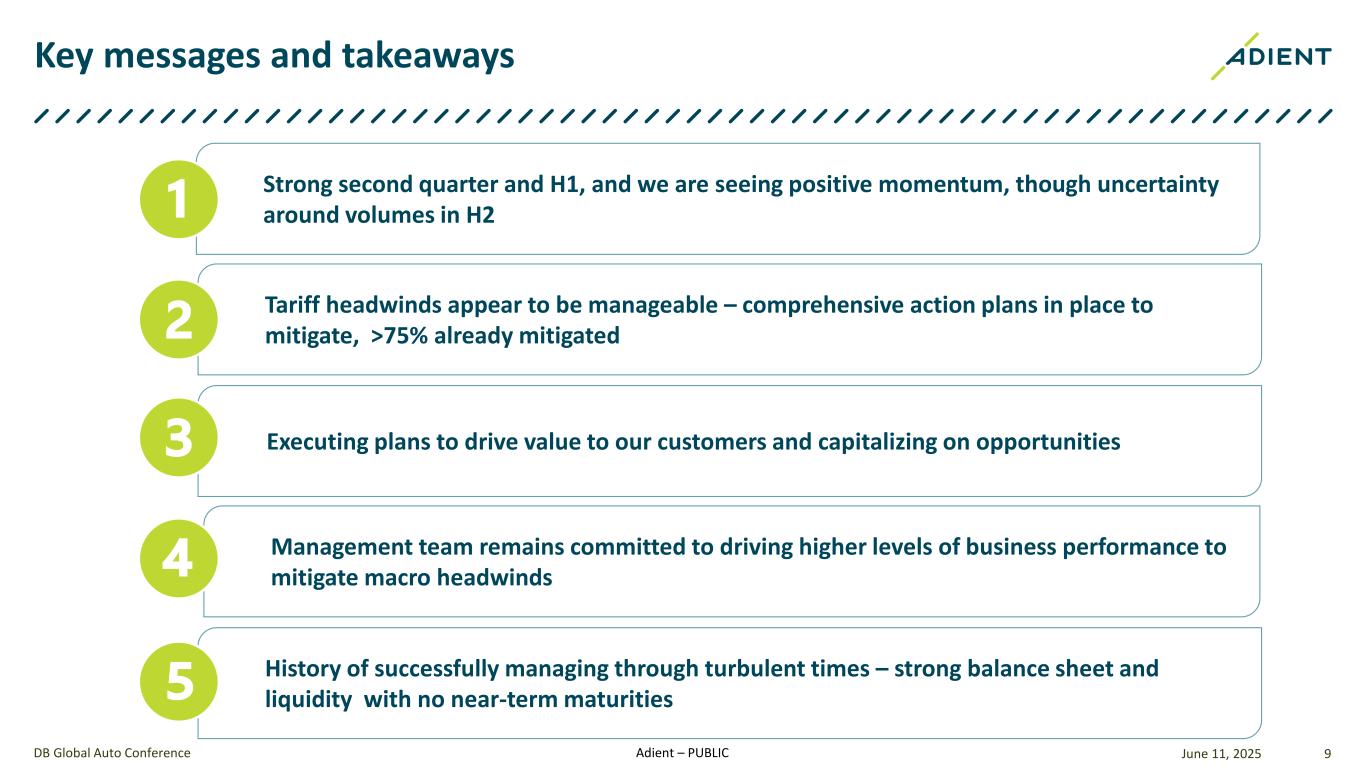 Adient – PUBLIC Important Information Adient has made statements in this document that are forward-looking and, therefore, are subject to risks and uncertainties. All statements in this document other than statements of historical fact are statements that are, or could be, deemed “forward-looking statements” within the meaning of the Private Securities Litigation Reform Act of 1995. In this document, statements regarding Adient’s expectations for its deleveraging activities, the timing, benefits and outcomes of those activities, as well as its future financial position, sales, costs, earnings, cash flows, other measures of results of operations, capital expenditures or debt levels and plans, objectives, market position, outlook, targets, guidance or goals are forward-looking statements. Words such as “may,” “will,” “expect,” “intend,” “estimate,” “anticipate,” “believe,” “should,” “forecast,” “project” or “plan” or terms of similar meaning are also generally intended to identify forward-looking statements. Adient cautions that these statements are subject to numerous important risks, uncertainties, assumptions and other factors, some of which are beyond Adient’s control, that could cause Adient’s actual results to differ materially from those expressed or implied by such forward-looking statements, including, among others, risks related to the effects of local and national economic, credit and capital market conditions (including the persistence of high interest rates, vehicle affordability and volatile currency exchange rates) on the global economy, uncertainties in U.S. administrative policy regarding trade agreements, tariffs and other international trade relations, automotive vehicle production levels, mix and schedules, as well as the concentration of exposure to certain automotive manufacturers, shifts in market shares among vehicles, vehicle segments or away from vehicles on which Adient has significant content, changes in consumer demand, risks associated with Adient’s joint ventures, volatile energy markets, Adient’s ability and timing of customer recoveries for increased input costs, the availability of raw materials and component products (including components required by Adient’s customers for the manufacture of vehicles), geopolitical uncertainties such as the Ukraine and Middle East conflicts and the impact on the regional and global economies and additional pressure on supply chain and vehicle production, the ability of Adient to effectively launch new business at forecast and profitable levels, the ability of Adient to successfully identify suitable opportunities for organic investment and/or acquisitions and to integrate such investments and/or acquisitions; work stoppages, including due to strikes, supply chain disruptions and similar events, wage inflationary pressures due to labor shortages and new labor negotiations, the ability of Adient to execute its restructuring plans and achieve the desired benefit, the ability of Adient to meet debt service requirements and, terms of future financing, the impact of global tax reform legislation, potential adjustment of the value of deferred tax assets, global climate change and related emphasis on sustainability matters by various stakeholders, and the ability of Adient to achieve its sustainability-related goals, cancellation of or changes to commercial arrangements, and the ability of Adient to identify, recruit and retain key leadership. A detailed discussion of risks related to Adient’s business is included in the section entitled “Risk Factors” in Adient’s Annual Report on Form 10-K for the fiscal year ended September 30, 2024 filed with the U.S. Securities and Exchange Commission (the “SEC”) on November 18, 2024, in Adient’s Quarterly Report on Form 10-Q for the fiscal quarter ended March 31, 2025 filed with the SEC on May 7, 2025, and in subsequent reports filed with or furnished to the SEC, available at www.sec.gov. Potential investors and others should consider these factors in evaluating the forward-looking statements and should not place undue reliance on such statements. The forward-looking statements included in this document are made only as of the date of this document, unless otherwise specified, and, except as required by law, Adient assumes no obligation, and disclaims any obligation, to update such statements to reflect events or circumstances occurring after the date of this document. In addition, this document includes certain projections provided by Adient with respect to the anticipated future performance of Adient’s businesses. Such projections reflect various assumptions of Adient’s management concerning the future performance of Adient’s businesses, which may or may not prove to be correct. The actual results may vary from the anticipated results and such variations may be material. Adient does not undertake any obligation to update the projections to reflect events or circumstances or changes in expectations after the date of this document or to reflect the occurrence of subsequent events. No representations or warranties are made as to the accuracy or reasonableness of such assumptions, or the projections based thereon. This document also contains non-GAAP financial information because Adient’s management believes it may assist investors in evaluating Adient’s on-going operations. Adient believes these non-GAAP disclosures provide important supplemental information to management and investors regarding financial and business trends relating to Adient’s financial condition and results of operations. Investors should not consider these non-GAAP measures as alternatives to the related GAAP measures. For complete details and to see reconciliations of non-GAAP measures to their most directly comparable GAAP measures, visit the events section of the Adient investor website at www.investors.adient.com/events-and-present