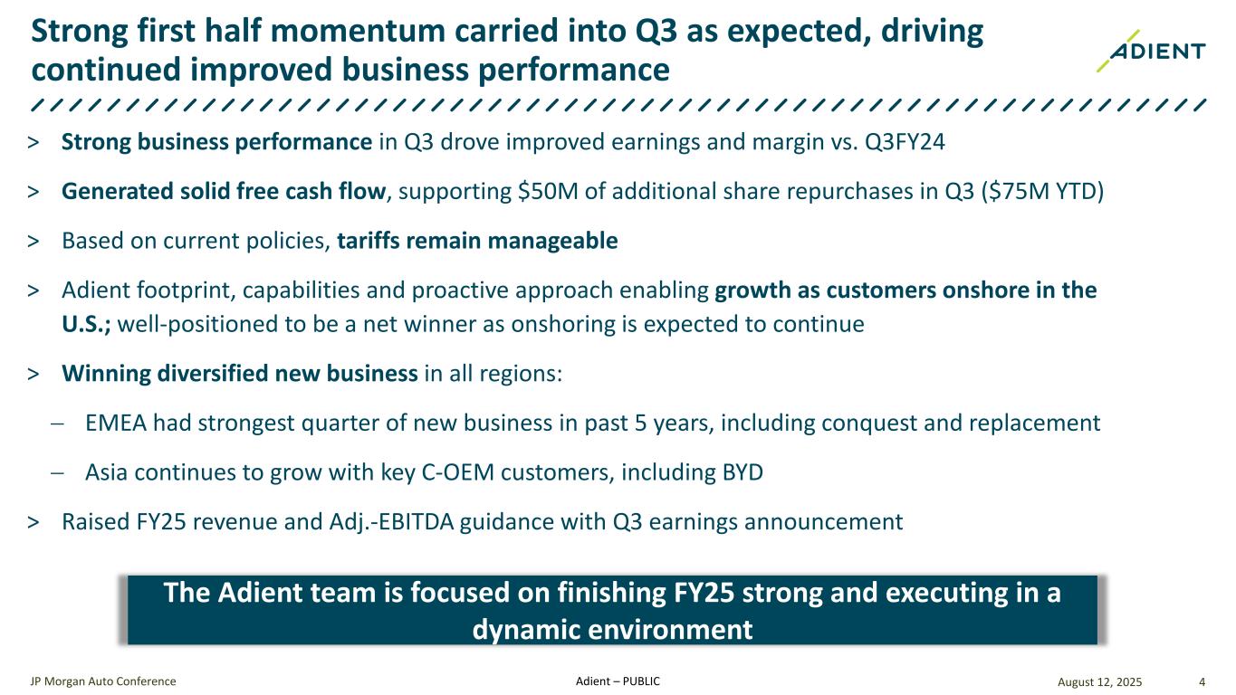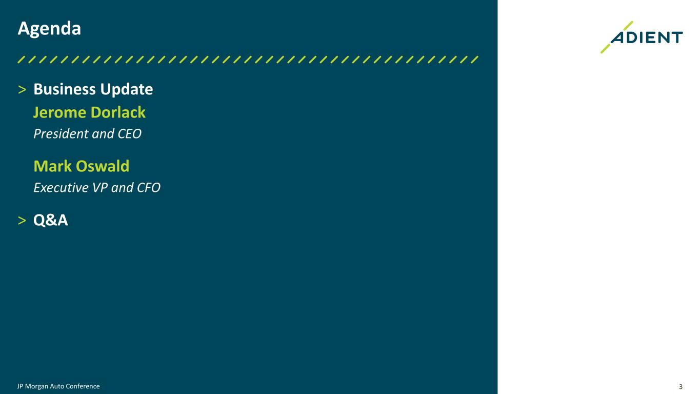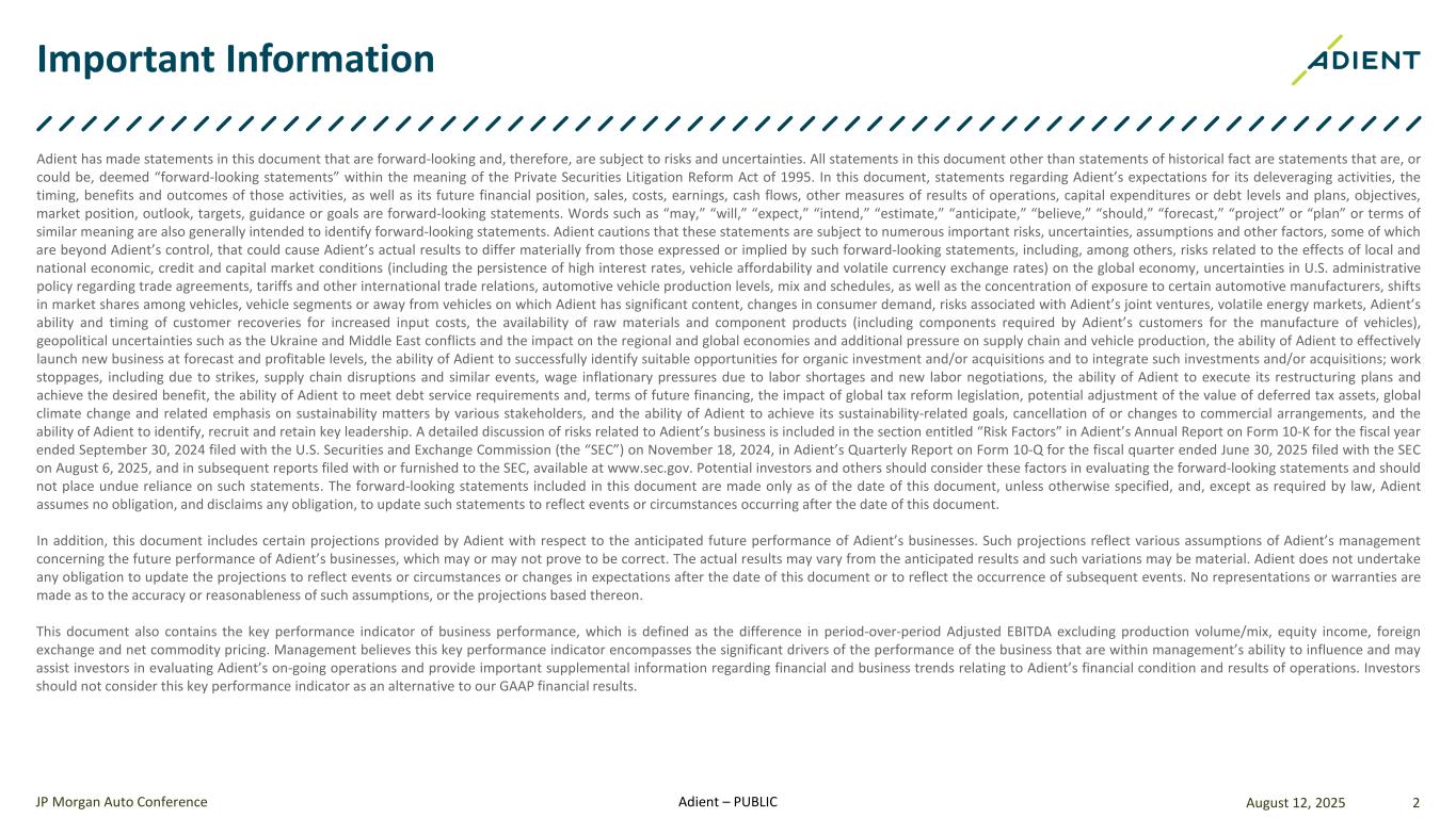 Adient – PUBLIC Important Information August 12, 2025JP Morgan Auto Conference 2 Adient has made statements in this document that are forward-looking and, therefore, are subject to risks and uncertainties. All statements in this document other than statements of historical fact are statements that are, or could be, deemed “forward-looking statements” within the meaning of the Private Securities Litigation Reform Act of 1995. In this document, statements regarding Adient’s expectations for its deleveraging activities, the timing, benefits and outcomes of those activities, as well as its future financial position, sales, costs, earnings, cash flows, other measures of results of operations, capital expenditures or debt levels and plans, objectives, market position, outlook, targets, guidance or goals are forward-looking statements. Words such as “may,” “will,” “expect,” “intend,” “estimate,” “anticipate,” “believe,” “should,” “forecast,” “project” or “plan” or terms of similar meaning are also generally intended to identify forward-looking statements. Adient cautions that these statements are subject to numerous important risks, uncertainties, assumptions and other factors, some of which are beyond Adient’s control, that could cause Adient’s actual results to differ materially from those expressed or implied by such forward-looking statements, including, among others, risks related to the effects of local and national economic, credit and capital market conditions (including the persistence of high interest rates, vehicle affordability and volatile currency exchange rates) on the global economy, uncertainties in U.S. administrative policy regarding trade agreements, tariffs and other international trade relations, automotive vehicle production levels, mix and schedules, as well as the concentration of exposure to certain automotive manufacturers, shifts in market shares among vehicles, vehicle segments or away from vehicles on which Adient has significant content, changes in consumer demand, risks associated with Adient’s joint ventures, volatile energy markets, Adient’s ability and timing of customer recoveries for increased input costs, the availability of raw materials and component products (including components required by Adient’s customers for the manufacture of vehicles), geopolitical uncertainties such as the Ukraine and Middle East conflicts and the impact on the regional and global economies and additional pressure on supply chain and vehicle production, the ability of Adient to effectively launch new business at forecast and profitable levels, the ability of Adient to successfully identify suitable opportunities for organic investment and/or acquisitions and to integrate such investments and/or acquisitions; work stoppages, including due to strikes, supply chain disruptions and similar events, wage inflationary pressures due to labor shortages and new labor negotiations, the ability of Adient to execute its restructuring plans and achieve the desired benefit, the ability of Adient to meet debt service requirements and, terms of future financing, the impact of global tax reform legislation, potential adjustment of the value of deferred tax assets, global climate change and related emphasis on sustainability matters by various stakeholders, and the ability of Adient to achieve its sustainability-related goals, cancellation of or changes to commercial arrangements, and the ability of Adient to identify, recruit and retain key leadership. A detailed discussion of risks related to Adient’s business is included in the section entitled “Risk Factors” in Adient’s Annual Report on Form 10-K for the fiscal year ended September 30, 2024 filed with the U.S. Securities and Exchange Commission (the “SEC”) on November 18, 2024, in Adient’s Quarterly Report on Form 10-Q for the fiscal quarter ended June 30, 2025 filed with the SEC on August 6, 2025, and in subsequent reports filed with or furnished to the SEC, available at www.sec.gov. Potential investors and others should consider these factors in evaluating the forward-looking statements and should not place undue reliance on such statements. The forward-looking statements included in this document are made only as of the date of this document, unless otherwise specified, and, except as required by law, Adient assumes no obligation, and disclaims any obligation, to update such statements to reflect events or circumstances occurring after the date of this document. In addition, this document includes certain projections provided by Adient with respect to the anticipated future performance of Adient’s businesses. Such projections reflect various assumptions of Adient’s management concerning the future performance of Adient’s businesses, which may or may not prove to be correct. The actual results may vary from the anticipated results and such variations may be material. Adient does not undertake any obligation to update the projections to reflect events or circumstances or changes in expectations after the date of this document or to reflect the occurrence of subsequent events. No representations or warranties are made as to the accuracy or reasonableness of such assumptions, or the projections based thereon. This document also contains the key performance indicator of business performance, which is defined as the difference in period-over-period Adjusted EBITDA excluding production volume/mix, equity income, foreign exchange and net commodity pricing. Management believes this key performance indicator encompasses the significant drivers of the performance of the business that are within management’s ability to influence and may assist investors in evaluating Adient’s on-going operations and provide important supplemental information regarding financial and business trends relating to Adient’s financial condition and results of operations. Investors should n