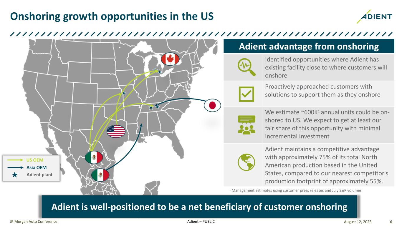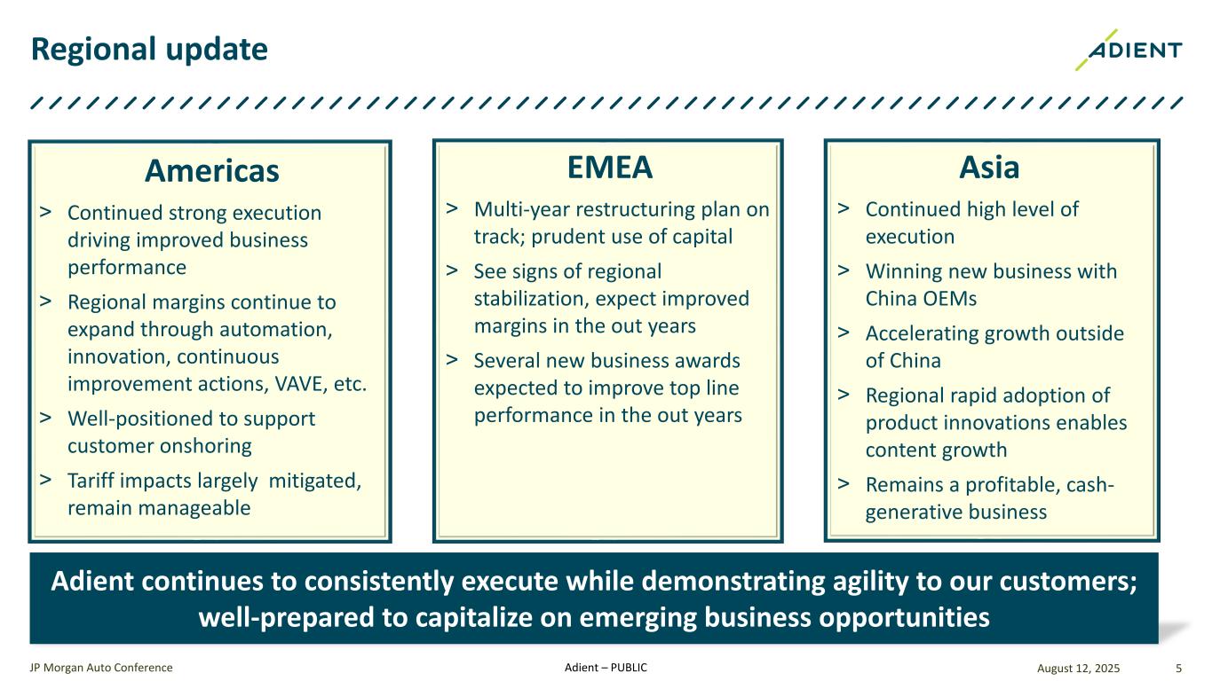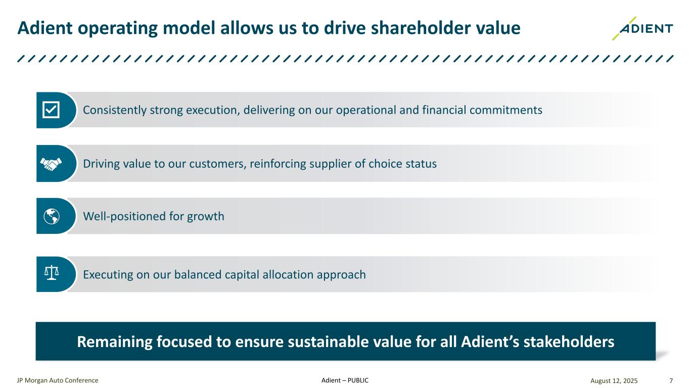Adient – PUBLIC Important Information August 12, 2025JP Morgan Auto Conference 2 Adient has made statements in this document that are forward-looking and, therefore, are subject to risks and uncertainties. All statements in this document other than statements of historical fact are statements that are, or could be, deemed “forward-looking statements” within the meaning of the Private Securities Litigation Reform Act of 1995. In this document, statements regarding Adient’s expectations for its deleveraging activities, the timing, benefits and outcomes of those activities, as well as its future financial position, sales, costs, earnings, cash flows, other measures of results of operations, capital expenditures or debt levels and plans, objectives, market position, outlook, targets, guidance or goals are forward-looking statements. Words such as “may,” “will,” “expect,” “intend,” “estimate,” “anticipate,” “believe,” “should,” “forecast,” “project” or “plan” or terms of similar meaning are also generally intended to identify forward-looking statements. Adient cautions that these statements are subject to numerous important risks, uncertainties, assumptions and other factors, some of which are beyond Adient’s control, that could cause Adient’s actual results to differ materially from those expressed or implied by such forward-looking statements, including, among others, risks related to the effects of local and national economic, credit and capital market conditions (including the persistence of high interest rates, vehicle affordability and volatile currency exchange rates) on the global economy, uncertainties in U.S. administrative policy regarding trade agreements, tariffs and other international trade relations, automotive vehicle production levels, mix and schedules, as well as the concentration of exposure to certain automotive manufacturers, shifts in market shares among vehicles, vehicle segments or away from vehicles on which Adient has significant content, changes in consumer demand, risks associated with Adient’s joint ventures, volatile energy markets, Adient’s ability and timing of customer recoveries for increased input costs, the availability of raw materials and component products (including components required by Adient’s customers for the manufacture of vehicles), geopolitical uncertainties such as the Ukraine and Middle East conflicts and the impact on the regional and global economies and additional pressure on supply chain and vehicle production, the ability of Adient to effectively launch new business at forecast and profitable levels, the ability of Adient to successfully identify suitable opportunities for organic investment and/or acquisitions and to integrate such investments and/or acquisitions; work stoppages, including due to strikes, supply chain disruptions and similar events, wage inflationary pressures due to labor shortages and new labor negotiations, the ability of Adient to execute its restructuring plans and achieve the desired benefit, the ability of Adient to meet debt service requirements and, terms of future financing, the impact of global tax reform legislation, potential adjustment of the value of deferred tax assets, global climate change and related emphasis on sustainability matters by various stakeholders, and the ability of Adient to achieve its sustainability-related goals, cancellation of or changes to commercial arrangements, and the ability of Adient to identify, recruit and retain key leadership. A detailed discussion of risks related to Adient’s business is included in the section entitled “Risk Factors” in Adient’s Annual Report on Form 10-K for the fiscal year ended September 30, 2024 filed with the U.S. Securities and Exchange Commission (the “SEC”) on November 18, 2024, in Adient’s Quarterly Report on Form 10-Q for the fiscal quarter ended June 30, 2025 filed with the SEC on August 6, 2025, and in subsequent reports filed with or furnished to the SEC, available at www.sec.gov. Potential investors and others should consider these factors in evaluating the forward-looking statements and should not place undue reliance on such statements. The forward-looking statements included in this document are made only as of the date of this document, unless otherwise specified, and, except as required by law, Adient assumes no obligation, and disclaims any obligation, to update such statements to reflect events or circumstances occurring after the date of this document. In addition, this document includes certain projections provided by Adient with respect to the anticipated future performance of Adient’s businesses. Such projections reflect various assumptions of Adient’s management concerning the future performance of Adient’s businesses, which may or may not prove to be correct. The actual results may vary from the anticipated results and such variations may be material. Adient does not undertake any obligation to update the projections to reflect events or circumstances or changes in expectations after the date of this document or to reflect the occurrence of subsequent events. No representations or warranties are made as to the accuracy or reasonableness of such assumptions, or the projections based thereon. This document also contains the key performance indicator of business performance, which is defined as the difference in period-over-period Adjusted EBITDA excluding production volume/mix, equity income, foreign exchange and net commodity pricing. Management believes this key performance indicator encompasses the significant drivers of the performance of the business that are within management’s ability to influence and may assist investors in evaluating Adient’s on-going operations and provide important supplemental information regarding financial and business trends relating to Adient’s financial condition and results of operations. Investors should n