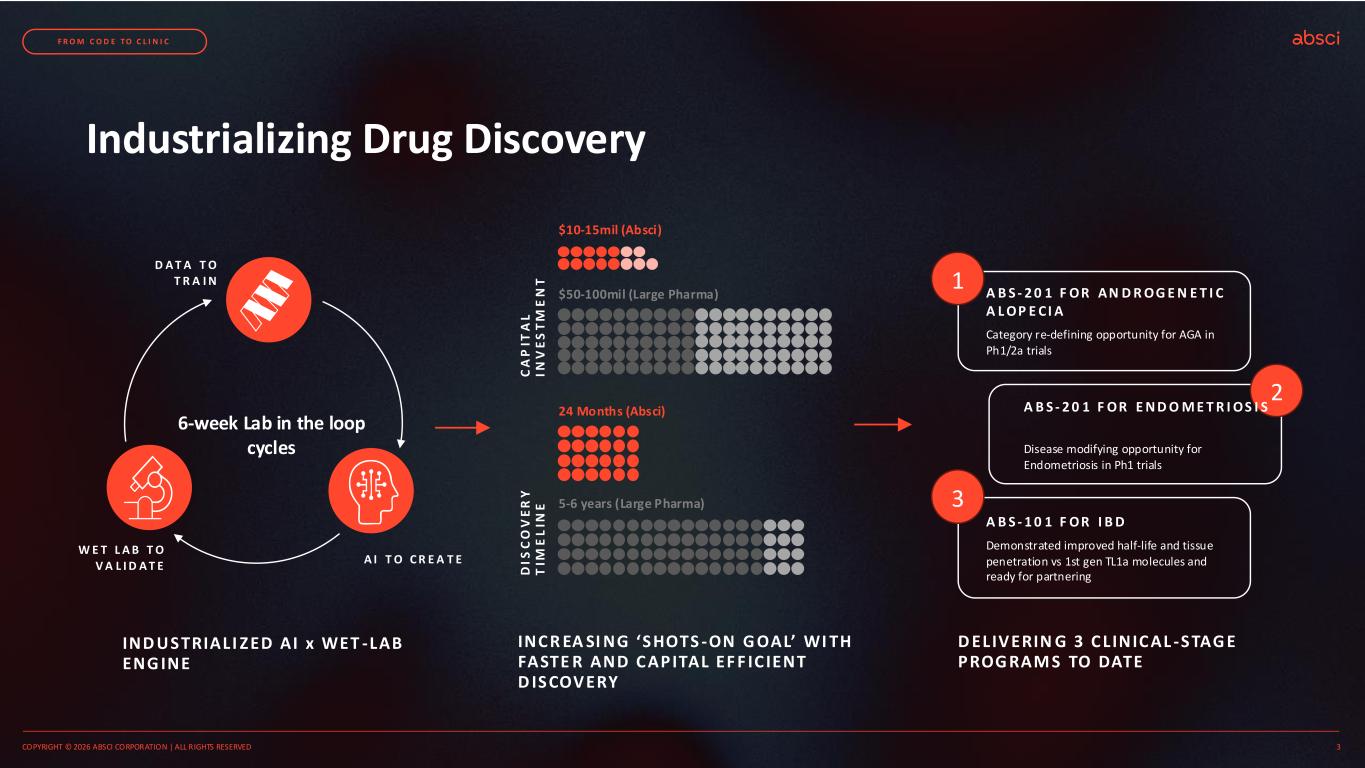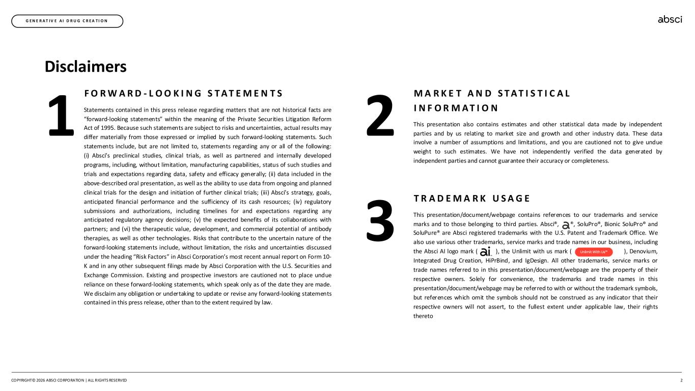 Disclaimers F O R W A R D - L O O K I N G S T A T E M E N T S Statements contained in this press release regarding matters that are not historical facts are “forward-looking statements” within the meaning of the Private Securities Litigation Reform Act of 1995. Because such statements are subject to risks and uncertainties, actual results may differ materially from those expressed or implied by such forward-looking statements. Such statements include, but are not limited to, statements regarding any or all of the following: (i) Absci’s preclinical studies, clinical trials, as well as partnered and internally developed programs, including, without limitation, manufacturing capabilities, status of such studies and trials and expectations regarding data, safety and efficacy generally; (ii) data included in the above-described oral presentation, as well as the ability to use data from ongoing and planned clinical trials for the design and initiation of further clinical trials; (iii) Absci’s strategy, goals, anticipated financial performance and the sufficiency of its cash resources; (iv) regulatory submissions and authorizations, including timelines for and expectations regarding any anticipated regulatory agency decisions; (v) the expected benefits of its collaborations with partners; and (vi) the therapeutic value, development, and commercial potential of antibody therapies, as well as other technologies. Risks that contribute to the uncertain nature of the forward-looking statements include, without limitation, the risks and uncertainties discussed under the heading “Risk Factors” in Absci Corporation’s most recent annual report on Form 10- K and in any other subsequent filings made by Absci Corporation with the U.S. Securities and Exchange Commission. Existing and prospective investors are cautioned not to place undue reliance on these forward-looking statements, which speak only as of the date they are made. We disclaim any obligation or undertaking to update or revise any forward-looking statements contained in this press release, other than to the extent required by law. 1 M A R K E T A N D S T A T I S T I C A L I N F O R M A T I O N This presentation also contains estimates and other statistical data made by independent parties and by us relating to market size and growth and other industry data. These data involve a number of assumptions and limitations, and you are cautioned not to give undue weight to such estimates. We have not independently verified the data generated by independent parties and cannot guarantee their accuracy or completeness. 2 T R A D E M A R K U S A G E This presentation/document/webpage contains references to our trademarks and service marks and to those belonging to third parties. Absci®, ®, SoluPro®, Bionic SoluPro® and SoluPure® are Absci registered trademarks with the U.S. Patent and Trademark Office. We also use various other trademarks, service marks and trade names in our business, including the Absci AI logo mark ( ), the Unlimit with us mark ( ), Denovium, Integrated Drug Creation, HiPrBind, and IgDesign. All other trademarks, service marks or trade names referred to in this presentation/document/webpage are the property of their respective owners. Solely for convenience, the trademarks and trade names in this presentation/document/webpage may be referred to with or without the trademark symbols, but references which omit the symbols should not be construed as any indicator that their respective owners will not assert, to the fullest extent under applicable law, their rights thereto 3 COPYRIGHT© 2026 ABSCI CORPORATION | ALL RIGHTS RESERVED 2 G E N E R A T IV E A I D R U G C R E A T I O N