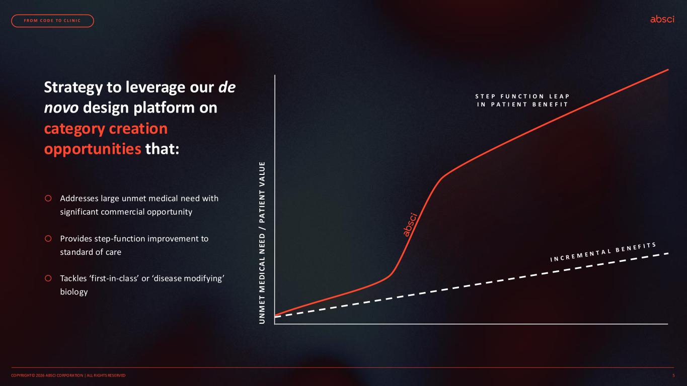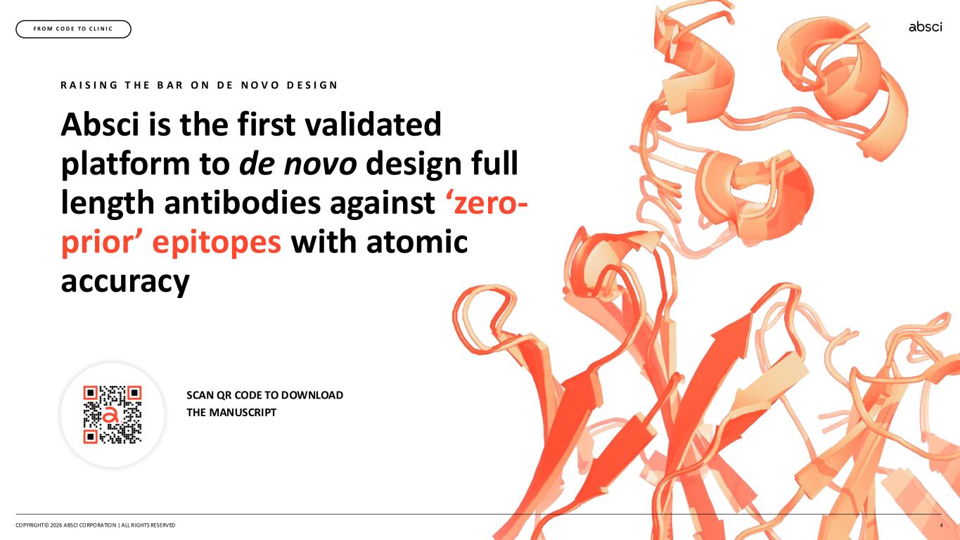 R A I S I N G T H E B A R O N D E N O V O D E S I G N Absci is the first validated platform to de novo design full length antibodies against ‘zero- prior’ epitopes with atomic accuracy COPYRIGHT© 2026 ABSCI CORPORATION | ALL RIGHTS RESERVED 4 SCAN QR CODE TO DOWNLOAD THE MANUSCRIPT F R O M C O D E T O C L I N I C