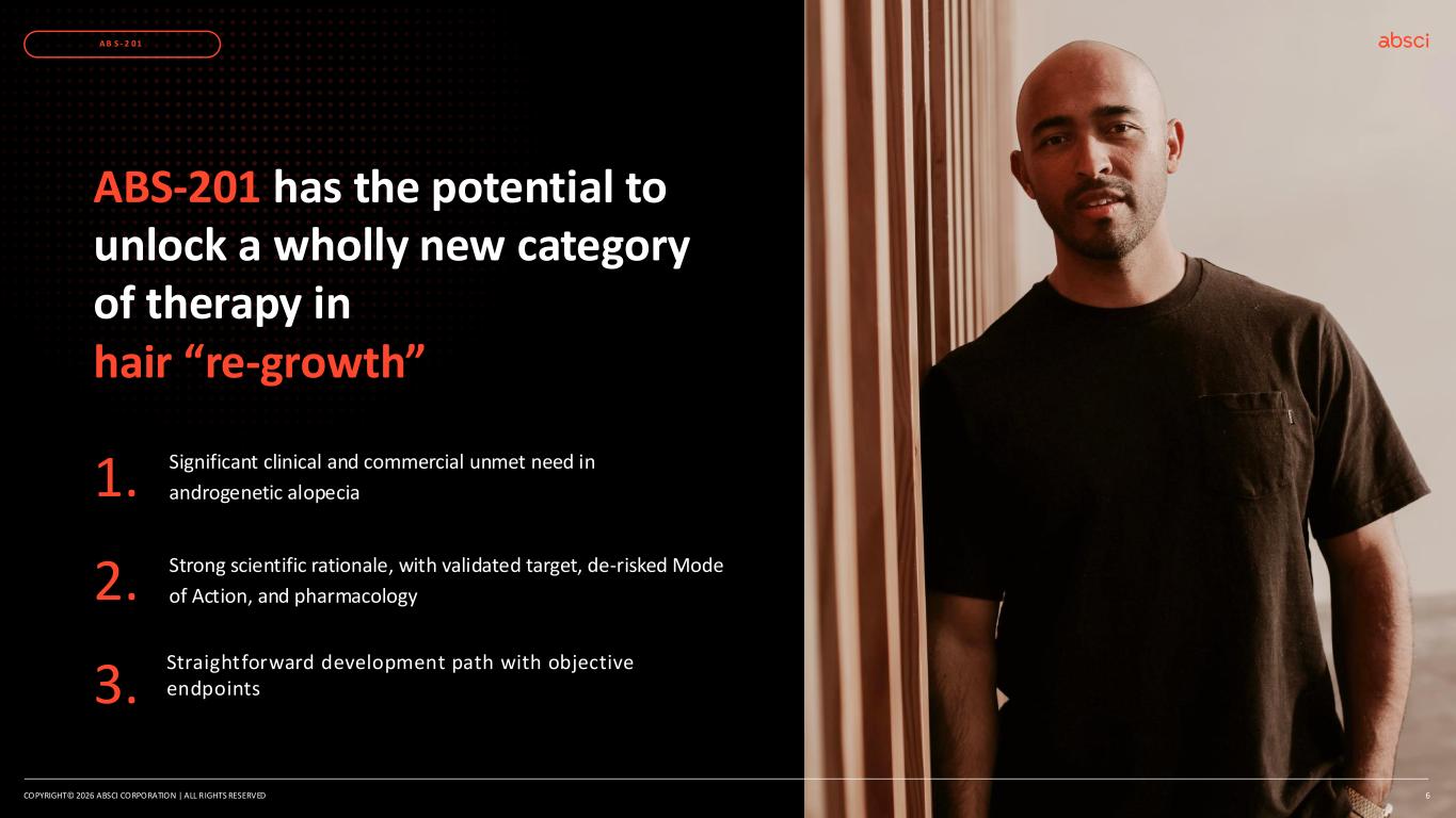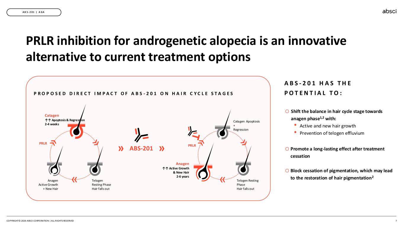 ABS-201 has the potential to unlock a wholly new category of therapy in hair “re-growth” Significant clinical and commercial unmet need in androgenetic alopecia1. Strong scientific rationale, with validated target, de-risked Mode of Action, and pharmacology2. 3. COPYRIGHT© 2026 ABSCI CORPORATION | ALL RIGHTS RESERVED 6 A B S - 2 0 1 Straightforward development path with objective endpoints