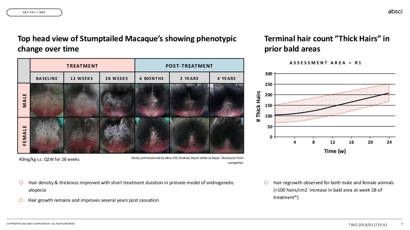 8 A B S 2 0 1 | A G A Terminal hair count ”Thick Hairs” in prior bald areas o Hair regrowth observed for both male and female animals (>100 hairs/cm2 increase in bald area at week 28 of treatment*) # Th ic k H ai rs Time (w) 200 100 0 250 150 50 300 4 8 12 16 20 24 A S S E S S M E N T A R E A = R 1 TREATMENT POST-TREATMENT 1 2 W EEK SBA SEL IN E 2 8 W EEK S 6 MON T HS 2 YE ARS 4 YE ARS F E M A L E M A LE Top head view of Stumptailed Macaque’s showing phenotypic change over time o Hair density & thickness improved with short treatment duration in primate model of androgenetic alopecia o Hair growth remains and improves several years post cessation 40mg/kg s.c. Q2W for 28 weeks Study commissioned by Absci CIO Andreas Busch while at Bayer. Disclosure from competitor COPYRIGHT© 2026 ABSCI CORPORATION | ALL RIGHTS RESERVED *WO 2019/011719 A1