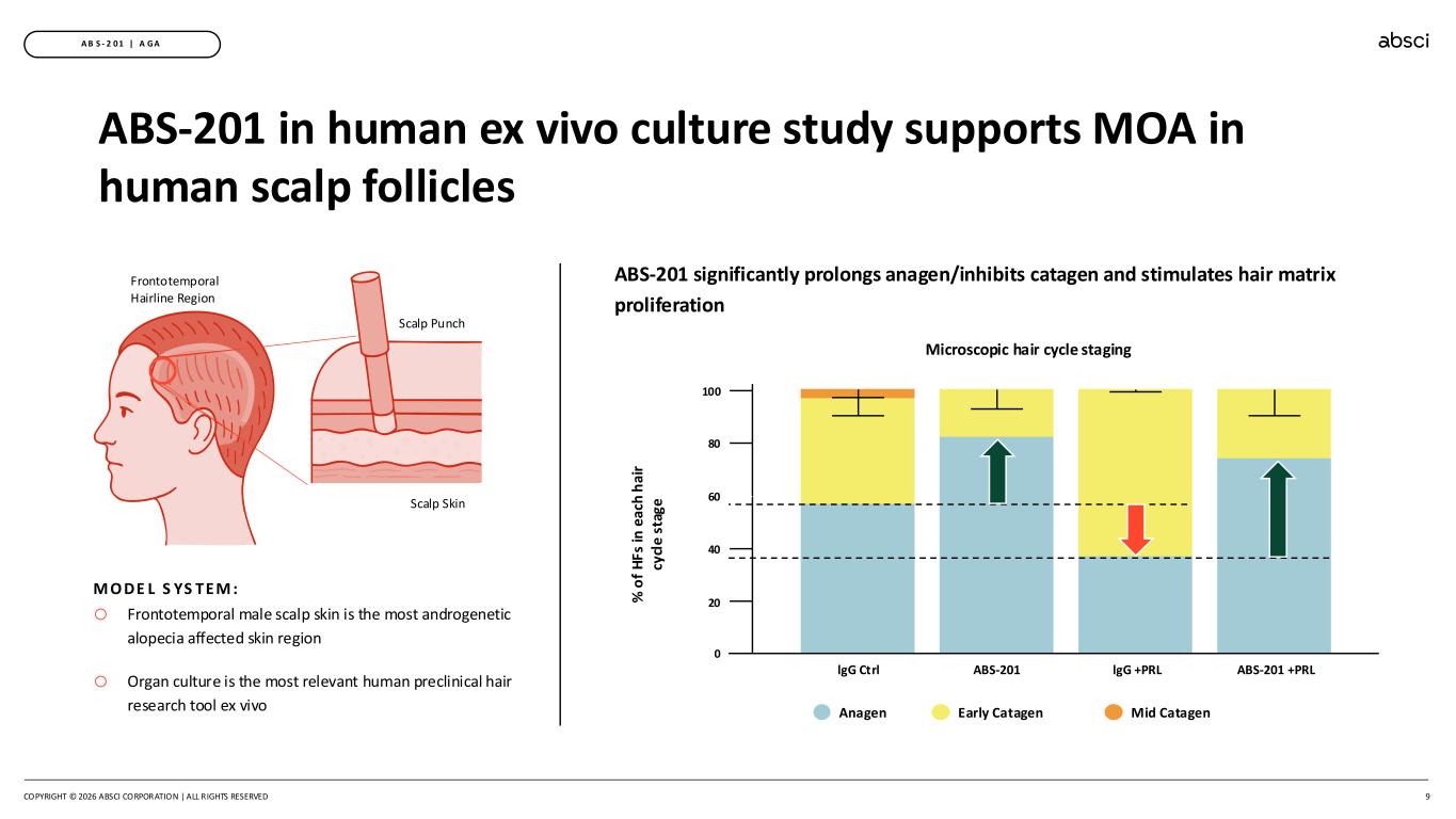 7 A B S - 2 0 1 | A GA PRLR inhibition for androgenetic alopecia is an innovative alternative to current treatment options P R O P O S E D D I R E C T I M P A C T O F A B S - 2 0 1 O N H A I R C Y C L E S T A G E S Telogen Resting Phase Hair falls out Catagen ↑↑ Apoptosis & Regression 2-4 weeks Anagen Active Growth + New Hair » PRLR ABS-201 »» Anagen ↑↑ Active Growth & New Hair 2-6 years Catagen Apoptosis + Regression Telogen Resting Phase Hair falls out » PRLR o Shift the balance in hair cycle stage towards anagen phase1,2 with: • Active and new hair growth • Prevention of telogen effluvium o Promote a long-lasting effect after treatment cessation o Block cessation of pigmentation, which may lead to the restoration of hair pigmentation2 A B S - 2 0 1 H A S T H E P O T E N T I A L T O : COPYRIGHT© 2026 ABSCI CORPORATION | ALL RIGHTS RESERVED