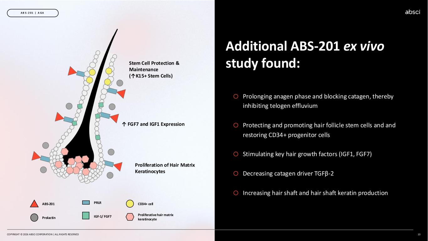 COPYRIGHT © 2026 ABSCI CORPORATION | ALL RIGHTS RESERVED 9 A B S - 2 0 1 | A GA ABS-201 in human ex vivo culture study supports MOA in human scalp follicles ABS-201 significantly prolongs anagen/inhibits catagen and stimulates hair matrix proliferation Anagen Early Catagen Mid Catagen lgG Ctrl ABS-201 lgG +PRL ABS-201 +PRL 80 40 0 100 60 20 Frontotemporal Hairline Region Scalp Punch Scalp Skin o Frontotemporal male scalp skin is the most androgenetic alopecia affected skin region o Organ culture is the most relevant human preclinical hair research tool ex vivo M O DE L S YS TEM : Microscopic hair cycle staging % o f H Fs in e ac h h ai r cy cl e s ta g e