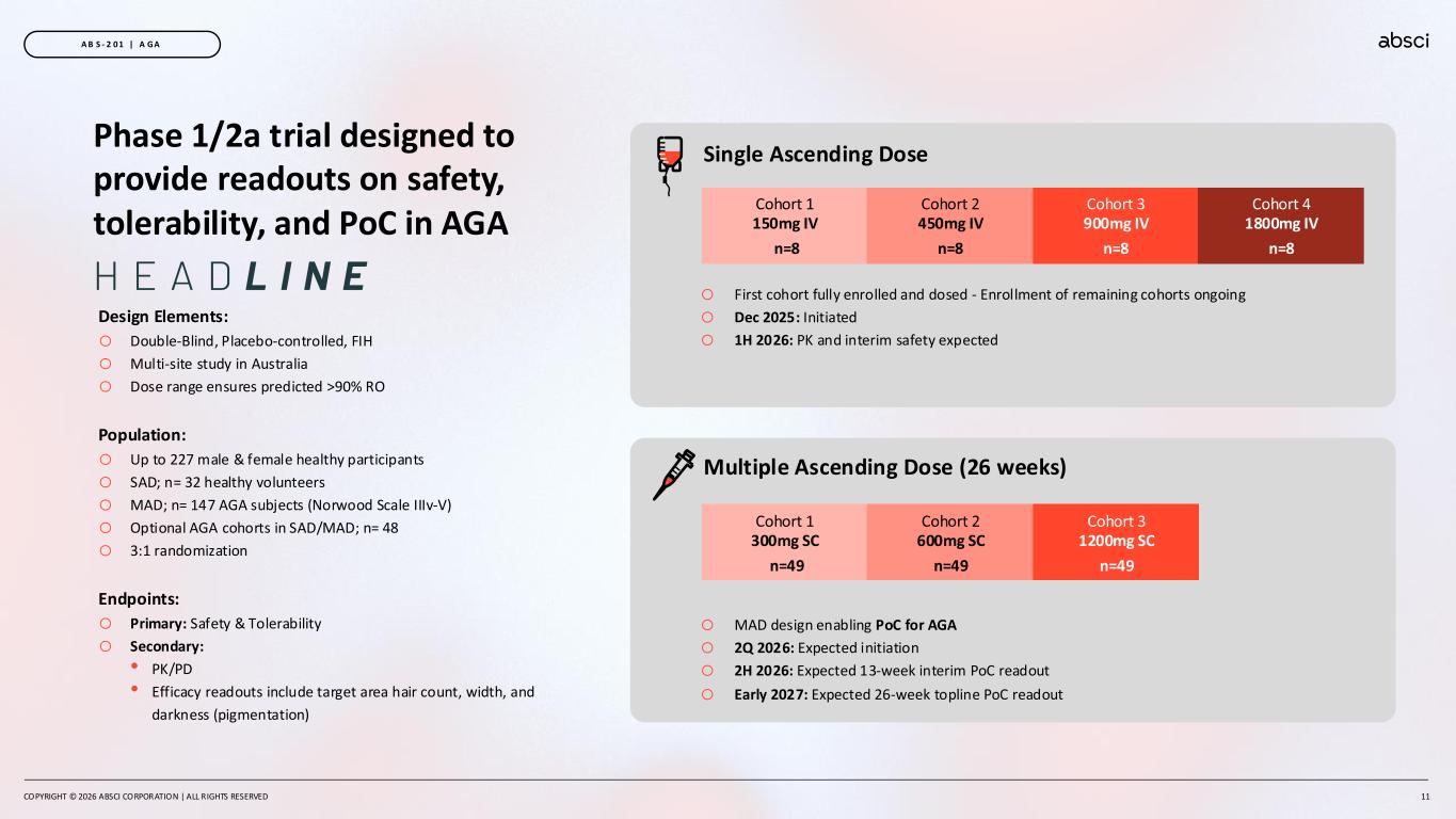 COPYRIGHT © 2026 ABSCI CORPORATION | ALL RIGHTS RESERVED 10 A B S - 2 0 1 | A GA Additional ABS-201 ex vivo study found: o Prolonging anagen phase and blocking catagen, thereby inhibiting telogen effluvium o Protecting and promoting hair follicle stem cells and and restoring CD34+ progenitor cells o Stimulating key hair growth factors (IGF1, FGF7) o Decreasing catagen driver TGFβ-2 o Increasing hair shaft and hair shaft keratin production IGF-1/ FGF7 PRLRABS-201 CD34+ cell Proliferative hair matrix keratinocyteProlactin Stem Cell Protection & Maintenance (↑K15+ Stem Cells) ↑ FGF7 and IGF1 Expression Proliferation of Hair Matrix Keratinocytes