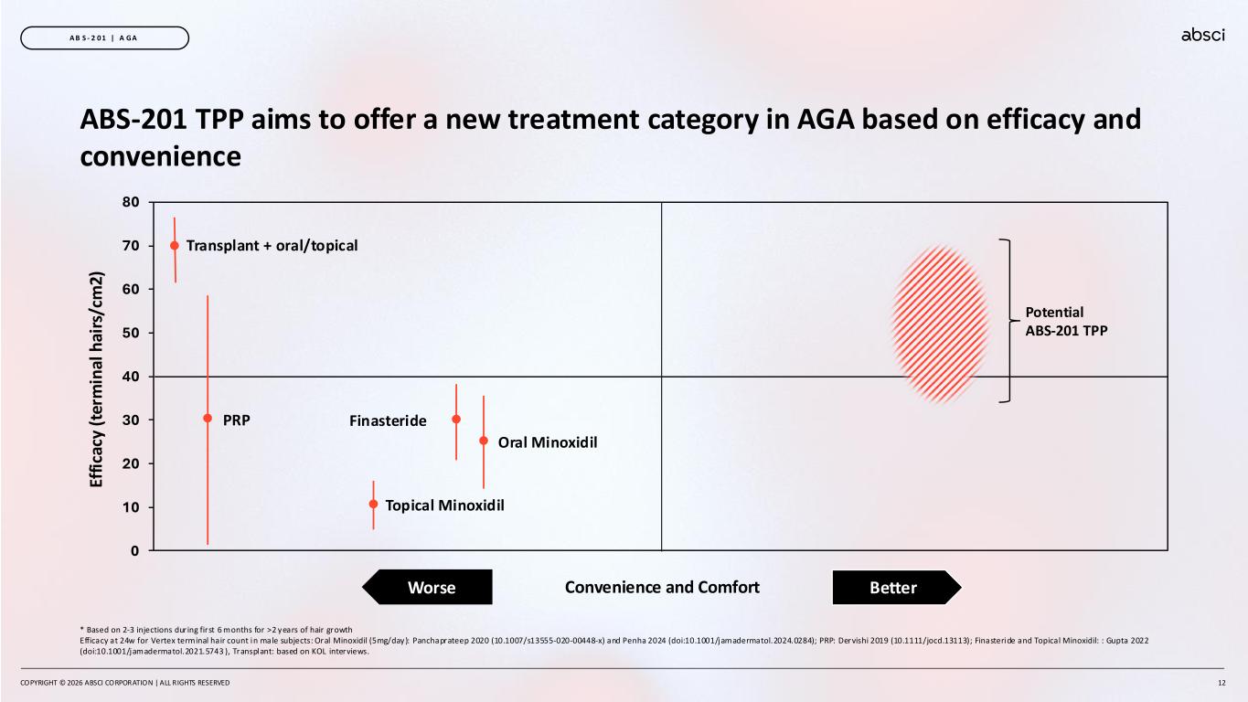 Phase 1/2a trial designed to provide readouts on safety, tolerability, and PoC in AGA Design Elements: o Double-Blind, Placebo-controlled, FIH o Multi-site study in Australia o Dose range ensures predicted >90% RO Population: o Up to 227 male & female healthy participants o SAD; n= 32 healthy volunteers o MAD; n= 147 AGA subjects (Norwood Scale IIIv-V) o Optional AGA cohorts in SAD/MAD; n= 48 o 3:1 randomization Endpoints: o Primary: Safety & Tolerability o Secondary: • PK/PD • Efficacy readouts include target area hair count, width, and darkness (pigmentation) COPYRIGHT © 2026 ABSCI CORPORATION | ALL RIGHTS RESERVED 11 A B S - 2 0 1 | A GA Single Ascending Dose Cohort 1 150mg IV n=8 Cohort 2 450mg IV n=8 Cohort 3 900mg IV n=8 Cohort 4 1800mg IV n=8 Cohort 1 300mg SC n=49 Cohort 2 600mg SC n=49 Cohort 3 1200mg SC n=49 Multiple Ascending Dose (26 weeks) o First cohort fully enrolled and dosed - Enrollment of remaining cohorts ongoing o Dec 2025: Initiated o 1H 2026: PK and interim safety expected o MAD design enabling PoC for AGA o 2Q 2026: Expected initiation o 2H 2026: Expected 13-week interim PoC readout o Early 2027: Expected 26-week topline PoC readout