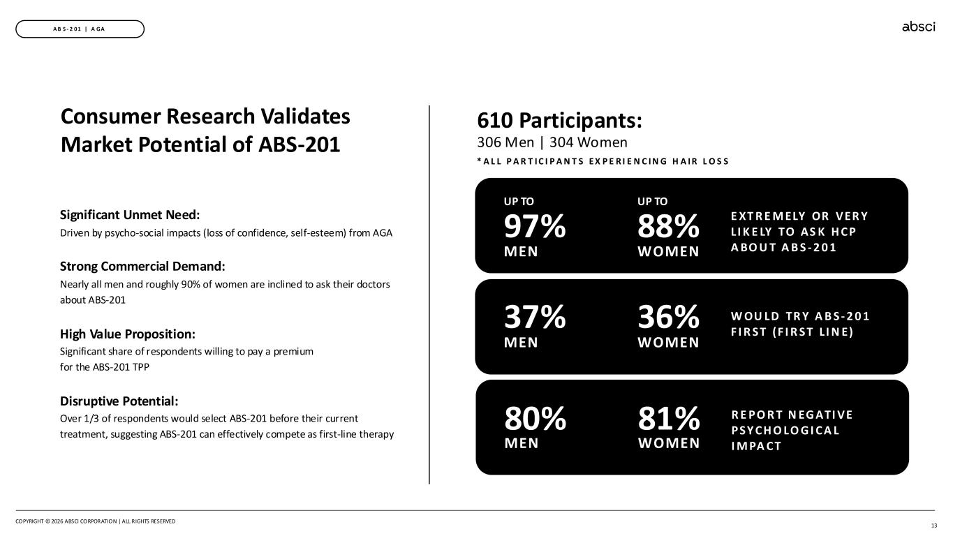 COPYRIGHT © 2026 ABSCI CORPORATION | ALL RIGHTS RESERVED 12 A B S - 2 0 1 | A GA ABS-201 TPP aims to offer a new treatment category in AGA based on efficacy and convenience 0 10 20 30 40 50 60 70 80 Ef fi ca cy ( te rm in al h ai rs /c m 2) Topical Minoxidil Oral Minoxidil FinasteridePRP Transplant + oral/topical Potential ABS-201 TPP * Based on 2-3 injections during first 6 months for >2 years of hair growth Efficacy at 24w for Vertex terminal hair count in male subjects: Oral Minoxidil (5mg/day): Panchaprateep 2020 (10.1007/s13555-020-00448-x) and Penha 2024 (doi:10.1001/jamadermatol.2024.0284); PRP: Dervishi 2019 (10.1111/jocd.13113); Finasteride and Topical Minoxidil: : Gupta 2022 (doi:10.1001/jamadermatol.2021.5743 ), Transplant: based on KOL interviews. Convenience and Comfort BetterWorse