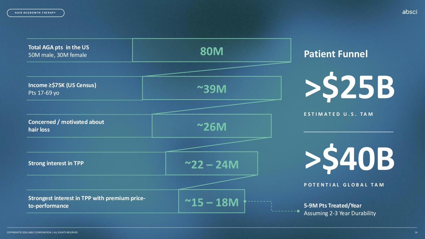5-9M Pts Treated/Year Assuming 2-3 Year Durability Patient Funnel >$25B E S T I M A T E D U . S . T A M >$40B P O T E N T I A L G L O B A L T A M Total AGA pts in the US 50M male, 30M female Income ≥$75K (US Census) Pts 17-69 yo Concerned / motivated about hair loss Strong interest in TPP Strongest interest in TPP with premium price- to-performance COPYRIGHT© 2026 ABSCI CORPORATION | ALL RIGHTS RESERVED 14 H A I R R E G R O W T H T H E R A P Y 80M ~39M ~26M ~22 – 24M ~15 – 18M
