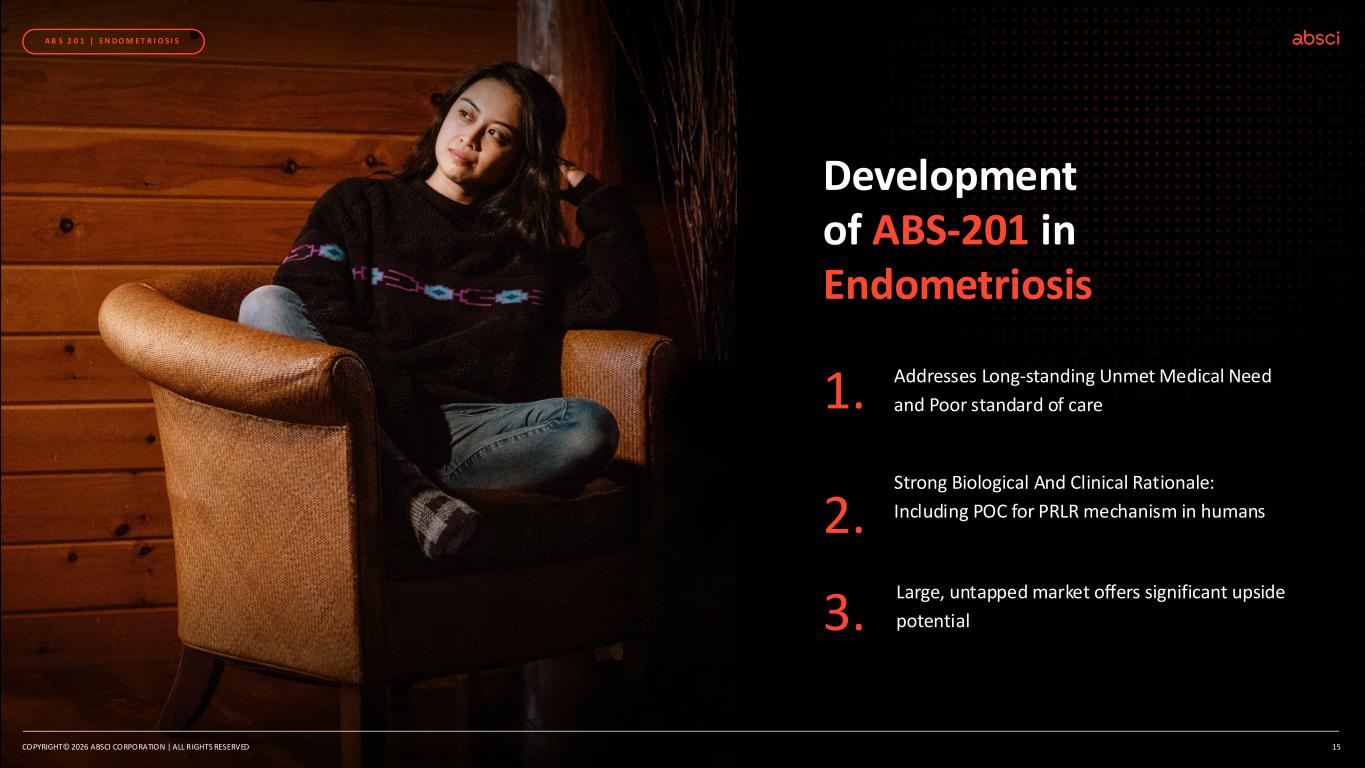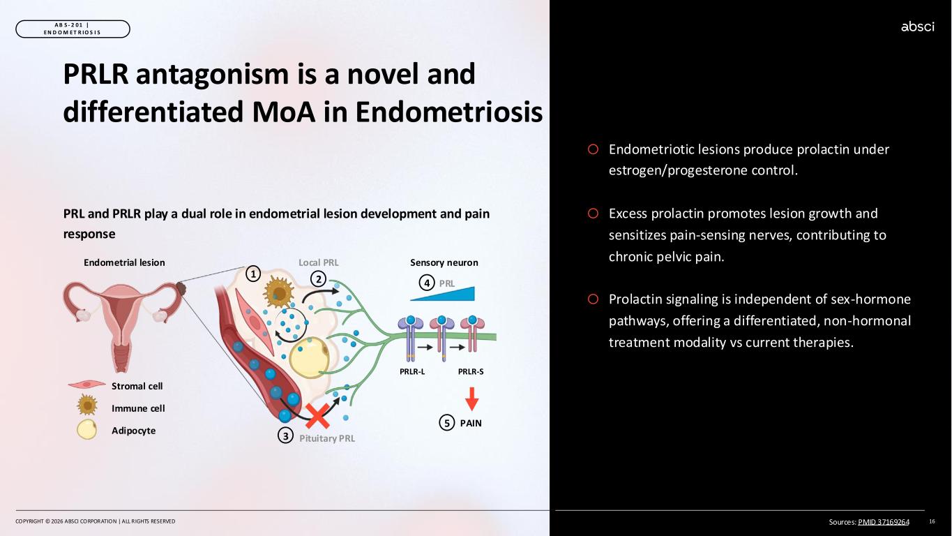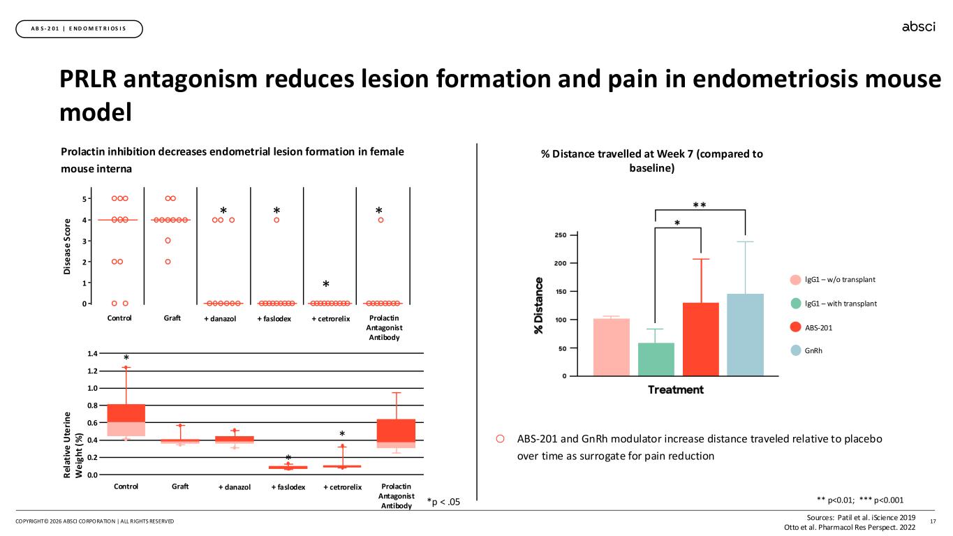 o Endometriotic lesions produce prolactin under estrogen/progesterone control. o Excess prolactin promotes lesion growth and sensitizes pain-sensing nerves, contributing to chronic pelvic pain. o Prolactin signaling is independent of sex-hormone pathways, offering a differentiated, non-hormonal treatment modality vs current therapies. COPYRIGHT © 2026 ABSCI CORPORATION | ALL RIGHTS RESERVED 16 A B S - 2 0 1 | E N D O M E T R IO S I S PRLR antagonism is a novel and differentiated MoA in Endometriosis PRL and PRLR play a dual role in endometrial lesion development and pain response Stromal cell Immune cell Adipocyte PRL 1 2 Endometrial lesion Local PRL PRLR-L PRLR-S Sensory neuron PAIN Pituitary PRL3 5 4 Sources: PMID 37169264