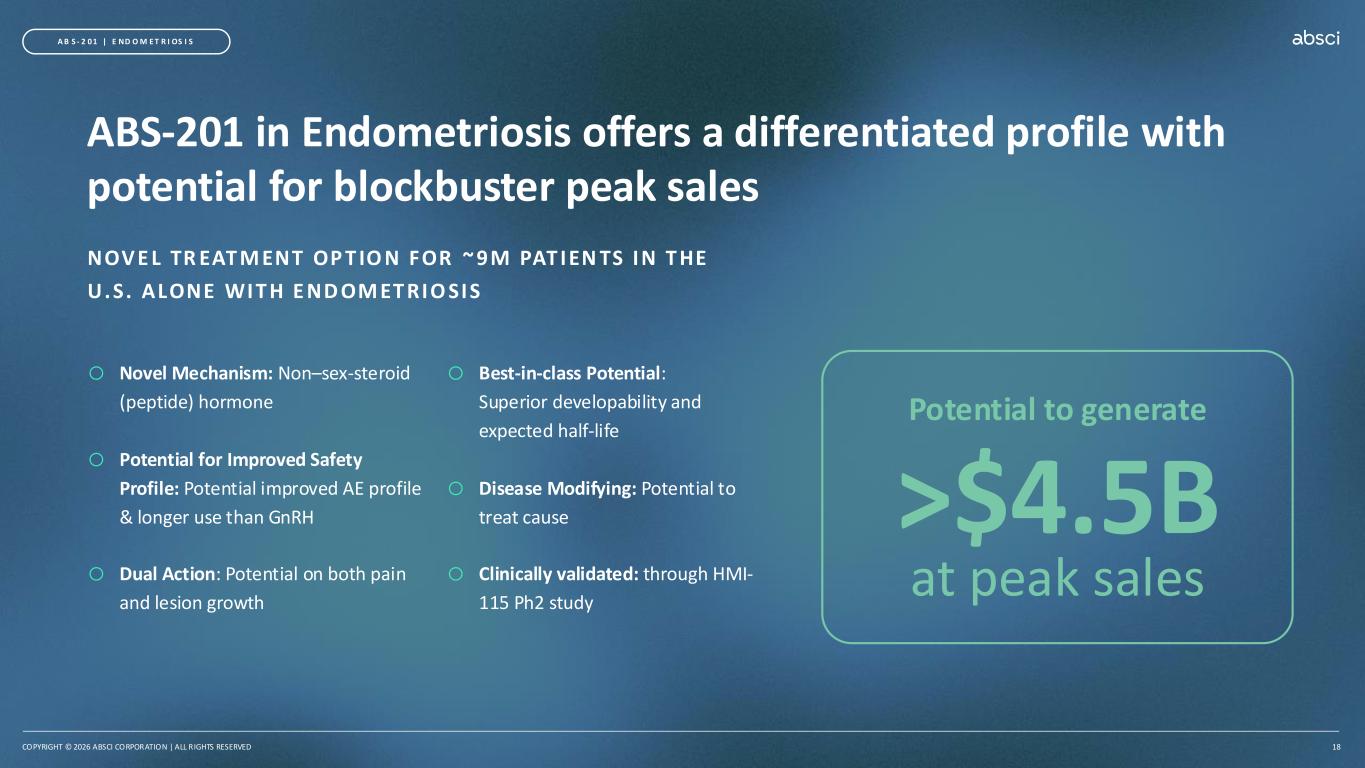 COPYRIGHT © 2026 ABSCI CORPORATION | ALL RIGHTS RESERVED 18 >$4.5B at peak sales Potential to generate A B S - 2 0 1 | E ND O M E T R I OS I S ABS-201 in Endometriosis offers a differentiated profile with potential for blockbuster peak sales NOV E L TR EAT M ENT OP T IO N FOR ~ 9M PAT IEN TS IN T HE U.S. ALONE WIT H E ND OM ET RIO SIS o Novel Mechanism: Non–sex-steroid (peptide) hormone o Potential for Improved Safety Profile: Potential improved AE profile & longer use than GnRH o Dual Action: Potential on both pain and lesion growth o Best-in-class Potential: Superior developability and expected half-life o Disease Modifying: Potential to treat cause o Clinically validated: through HMI- 115 Ph2 study