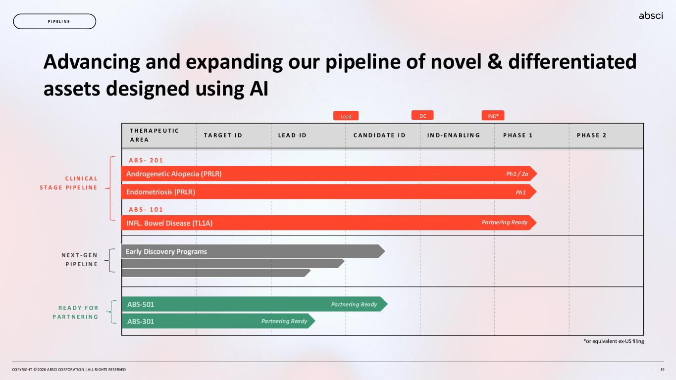 Advancing and expanding our pipeline of novel & differentiated assets designed using AI *or equivalent ex-US filing C L I N I C A L S T A G E P I P E L I N E R E A D Y F O R P A R T N E R I N G N E X T - G E N P I P E L I N E COPYRIGHT © 2026 ABSCI CORPORATION | ALL RIGHTS RESERVED 19 P I P E L I N E T H E R A P E U T I C A R E A T A R G E T I D L E A D I D C A N D I D A T E I D I N D - E N A B L I N G P H A S E 1 P H A S E 2 A B S - 2 0 1 Androgenetic Alopecia (PRLR) Endometriosis (PRLR) A B S - 1 0 1 INFL. Bowel Disease (TL1A) Ph1 Partnering Ready ABS-501 ABS-301 Early Discovery Programs Partnering Ready Partnering Ready IND*DCLead Ph1 / 2a
