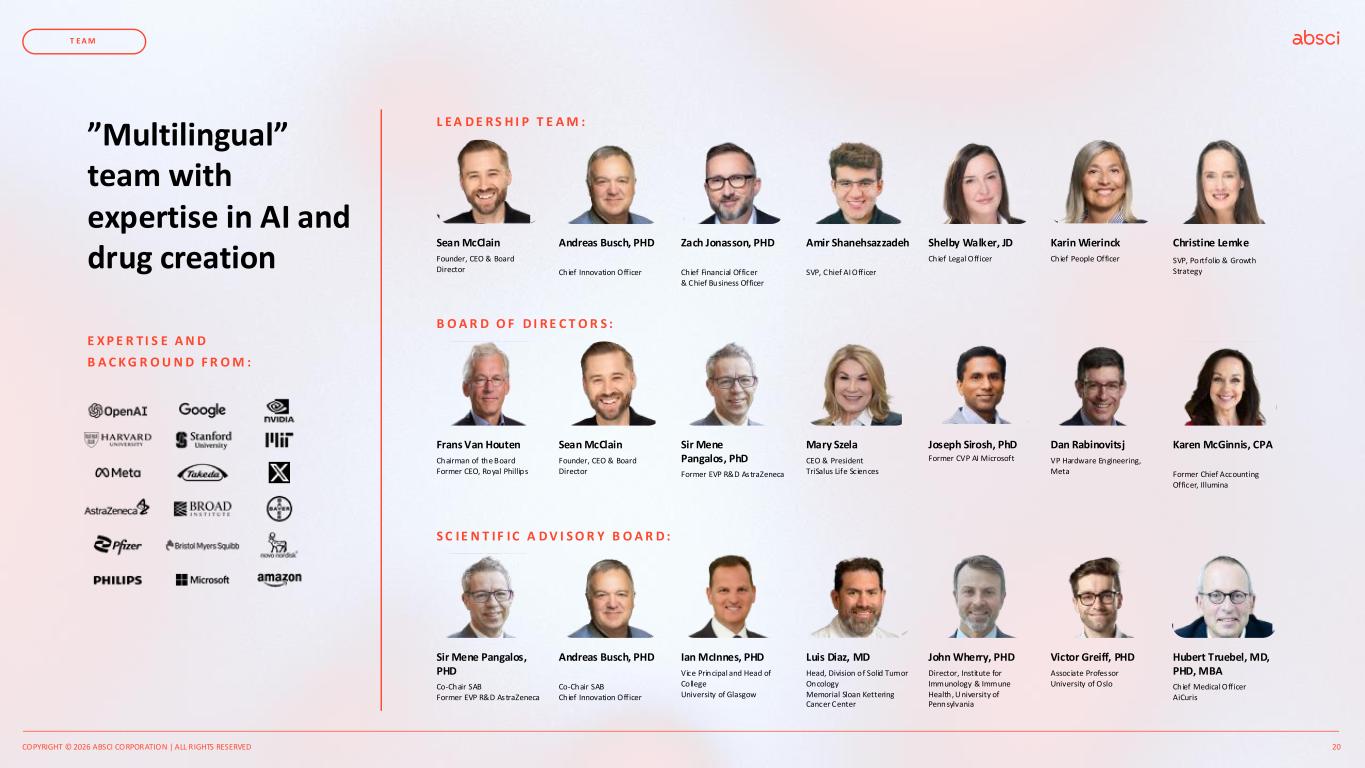 ”Multilingual” team with expertise in AI and drug creation COPYRIGHT © 2026 ABSCI CORPORATION | ALL RIGHTS RESERVED 20 T E A M Sean McClain Founder, CEO & Board Director Zach Jonasson, PHD Chief Financial Officer & Chief Business Officer Amir Shanehsazzadeh SVP, Chief AI Officer Shelby Walker, JD Chief Legal Officer Karin Wierinck Chief People Officer Christine Lemke SVP, Portfolio & Growth Strategy L E A D E R S H I P T E A M : Sean McClain Founder, CEO & Board Director Sir Mene Pangalos, PhD Former EVP R&D AstraZeneca Mary Szela CEO & President TriSalus Life Sciences Joseph Sirosh, PhD Former CVP AI Microsoft Dan Rabinovitsj VP Hardware Engineering, Meta Karen McGinnis, CPA Former Chief Accounting Officer, Illumina Frans Van Houten Chairman of the Board Former CEO, Royal Phillips B O A R D O F D I R E C T O R S : Andreas Busch, PHD Co-Chair SAB Chief Innovation Officer Ian McInnes, PHD Vice Principal and Head of College University of Glasgow Luis Diaz, MD Head, Division of Solid Tumor Oncology Memorial Sloan Kettering Cancer Center John Wherry, PHD Director, Institute for Immunology & Immune Health, University of Pennsylvania Victor Greiff, PHD Associate Professor University of Oslo Hubert Truebel, MD, PHD, MBA Chief Medical Officer AiCuris Sir Mene Pangalos, PHD Co-Chair SAB Former EVP R&D AstraZeneca S C I E N T I F I C A D V I S O R Y B O A R D : Andreas Busch, PHD Chief Innovation Officer E X P E R T I S E A N D B A C K G R O U N D F R O M :