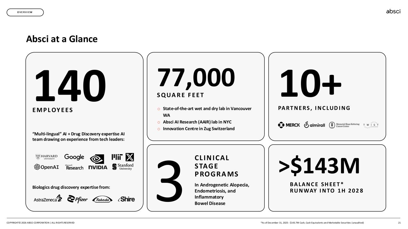 21 140 E M P L OY E E S Biologics drug discovery expertise from: “Multi-lingual” AI + Drug Discovery expertise AI team drawing on experience from tech leaders: 77,000 S Q UA R E F E E T o State-of-the-art wet and dry lab in Vancouver WA o Absci AI Research (AAIR) lab in NYC o Innovation Centre in Zug Switzerland 3 CL IN ICAL STAGE P RO GRA MS In Androgenetic Alopecia, Endometriosis, and Inflammatory Bowel Disease >$143M B A LA N C E SH EE T * R U N WAY I N TO 1 H 2 0 2 8 10+ PA R T N E R S , I N C LUD I N G Absci at a Glance O V E R V I E W COPYRIGHT© 2026 ABSCI CORPORATION | ALL RIGHTS RESERVED *As of December 31, 2025 - $143.7M Cash, Cash Equivalents and Marketable Securities (unaudited)