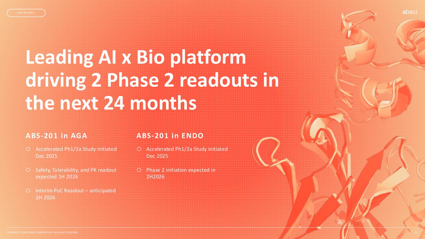 Leading AI x Bio platform driving 2 Phase 2 readouts in the next 24 months COPYRIGHT © 2026 ABSCI CORPORATION | ALL RIGHTS RESERVED 22 C A T A L Y S T S ABS-20 1 in AGA o Accelerated Ph1/2a Study initiated Dec 2025 o Safety, Tolerability, and PK readout expected 1H 2026 o Interim PoC Readout – anticipated 2H 2026 ABS-20 1 in ENDO o Accelerated Ph1/2a Study initiated Dec 2025 o Phase 2 initiation expected in 2H2026