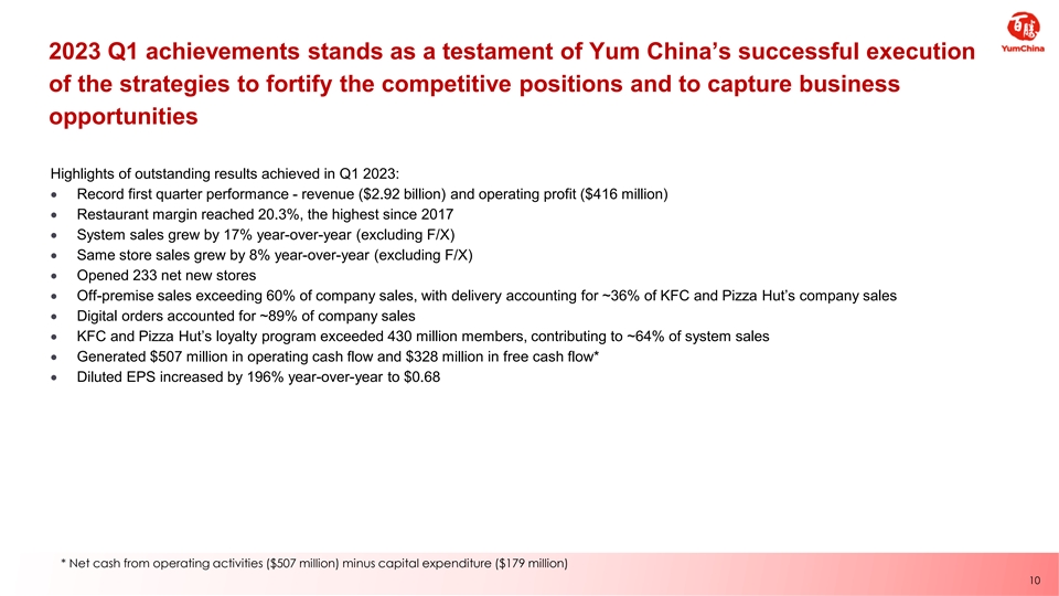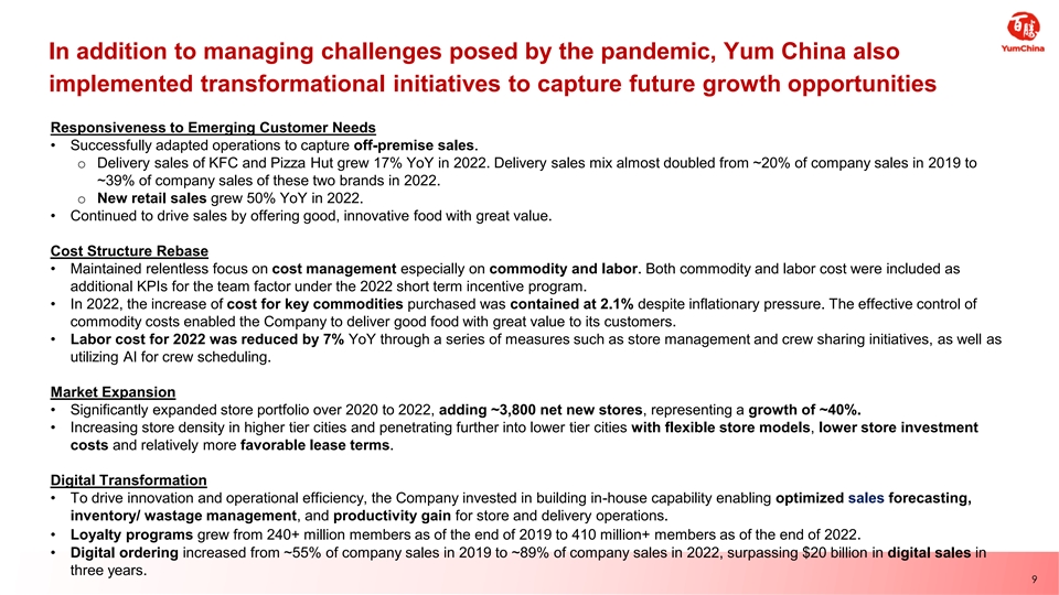 In addition to managing challenges posed by the pandemic, Yum China also implemented transformational initiatives to capture future growth opportunities Responsiveness to Emerging Customer Needs • Successfully adapted operations to capture off-premise sales. o Delivery sales of KFC and Pizza Hut grew 17% YoY in 2022. Delivery sales mix almost doubled from ~20% of company sales in 2019 to ~39% of company sales of these two brands in 2022. o New retail sales grew 50% YoY in 2022. • Continued to drive sales by offering good, innovative food with great value. Cost Structure Rebase • Maintained relentless focus on cost management especially on commodity and labor. Both commodity and labor cost were included as additional KPIs for the team factor under the 2022 short term incentive program. • In 2022, the increase of cost for key commodities purchased was contained at 2.1% despite inflationary pressure. The effective control of commodity costs enabled the Company to deliver good food with great value to its customers. • Labor cost for 2022 was reduced by 7% YoY through a series of measures such as store management and crew sharing initiatives, as well as utilizing AI for crew scheduling. Market Expansion • Significantly expanded store portfolio over 2020 to 2022, adding ~3,800 net new stores, representing a growth of ~40%. • Increasing store density in higher tier cities and penetrating further into lower tier cities with flexible store models, lower store investment costs and relatively more favorable lease terms. Digital Transformation • To drive innovation and operational efficiency, the Company invested in building in-house capability enabling optimized sales forecasting, inventory/ wastage management, and productivity gain for store and delivery operations. • Loyalty programs grew from 240+ million members as of the end of 2019 to 410 million+ members as of the end of 2022. • Digital ordering increased from ~55% of company sales in 2019 to ~89% of company sales in 2022, surpassing $20 billion in digital sales in three years. 9