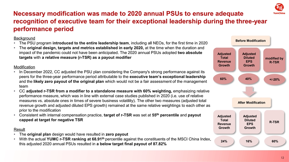 Necessary modification was made to 2020 annual PSUs to ensure adequate recognition of executive team for their exceptional leadership during the three-year performance period Background Before Modification • The PSU program introduced to the entire leadership team, including all NEOs, for the first time in 2020 • The original design, targets and metrics established in early 2020, at the time when the duration and impact of the pandemic could not have been anticipated. The 2020 annual PSUs adopted two absolute Adjusted Adjusted targets with a relative measure (r-TSR) as a payout modifier Total Diluted modified by Revenue EPS R-TSR Growth Growth Modification • In December 2022, CC adjusted the PSU plan considering the Company's strong performance against its peers for the three-year performance period attributable to the executive team’s exceptional leadership 60% 40% +/-20% and the likely zero payout of the original plan which would not be a fair assessment of the management team • CC adjusted r-TSR from a modifier to a standalone measure with 60% weighting, emphasizing relative performance measure, which was in line with external case studies published in 2020 (i.e. use of relative measures vs. absolute ones in times of severe business volatility). The other two measures (adjusted total After Modification revenue growth and adjusted diluted EPS growth) remained at the same relative weightings to each other as prior to the modification th • Consistent with internal compensation practice, target of r-TSR was set at 55 percentile and payout Adjusted Adjusted capped at target for negative TSR Total Diluted R-TSR Revenue EPS Growth Growth Result • The original plan design would have resulted in zero payout th • With the actual YUMC r-TSR ranking at 68.91 percentile against the constituents of the MSCI China Index, 24% 16% 60% this adjusted 2020 annual PSUs resulted in a below target final payout of 87.82% 12