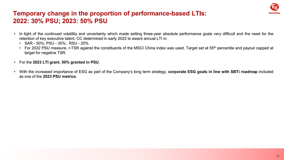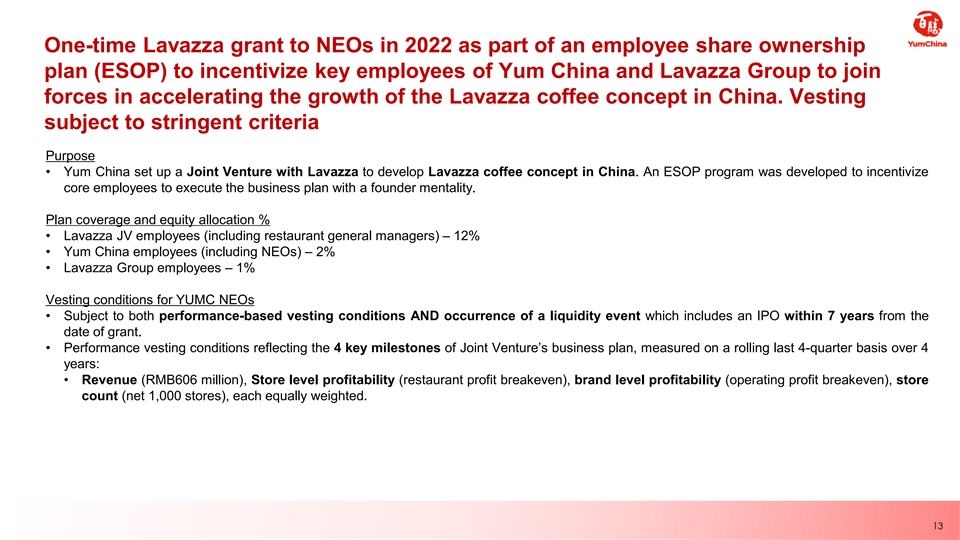 One-time Lavazza grant to NEOs in 2022 as part of an employee share ownership plan (ESOP) to incentivize key employees of Yum China and Lavazza Group to join forces in accelerating the growth of the Lavazza coffee concept in China. Vesting subject to stringent criteria Purpose • Yum China set up a Joint Venture with Lavazza to develop Lavazza coffee concept in China. An ESOP program was developed to incentivize core employees to execute the business plan with a founder mentality. Plan coverage and equity allocation % • Lavazza JV employees (including restaurant general managers) – 12% • Yum China employees (including NEOs) – 2% • Lavazza Group employees – 1% Vesting conditions for YUMC NEOs • Subject to both performance-based vesting conditions AND occurrence of a liquidity event which includes an IPO within 7 years from the date of grant. • Performance vesting conditions reflecting the 4 key milestones of Joint Venture’s business plan, measured on a rolling last 4-quarter basis over 4 years: • Revenue (RMB606 million), Store level profitability (restaurant profit breakeven), brand level profitability (operating profit breakeven), store count (net 1,000 stores), each equally weighted. 13