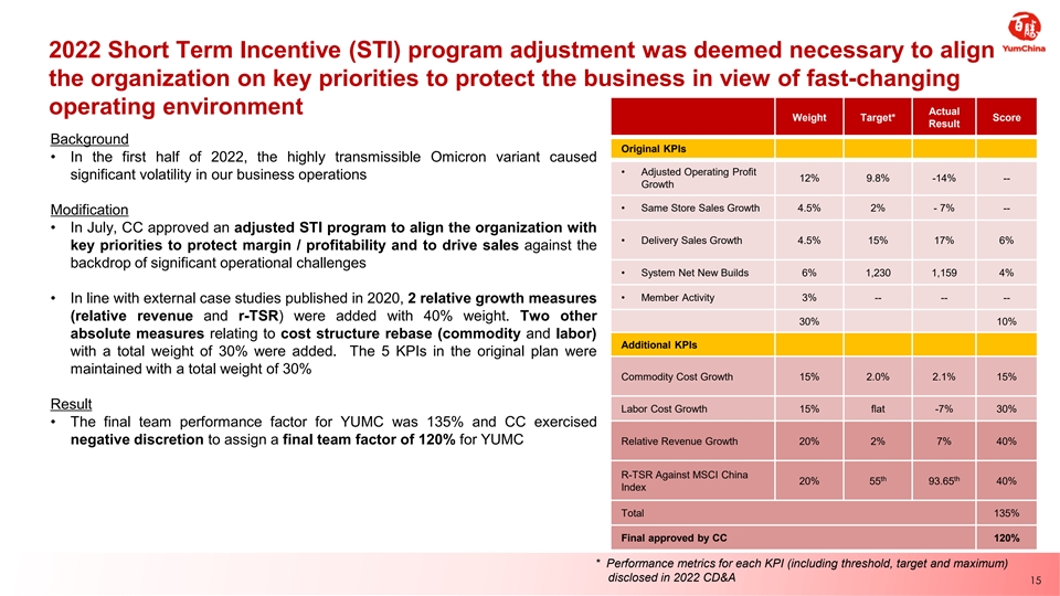Temporary change in the proportion of performance-based LTIs: 2022: 30% PSU; 2023: 50% PSU • In light of the continued volatility and uncertainty which made setting three-year absolute performance goals very difficult and the need for the retention of key executive talent, CC determined in early 2022 to award annual LTI in: • SAR - 50%; PSU - 30%; RSU - 20% th • For 2022 PSU measure, r-TSR against the constituents of the MSCI China index was used. Target set at 55 percentile and payout capped at target for negative TSR. • For the 2023 LTI grant, 50% granted in PSU. • With the increased importance of ESG as part of the Company’s long term strategy, corporate ESG goals in line with SBTi roadmap included as one of the 2023 PSU metrics. 14