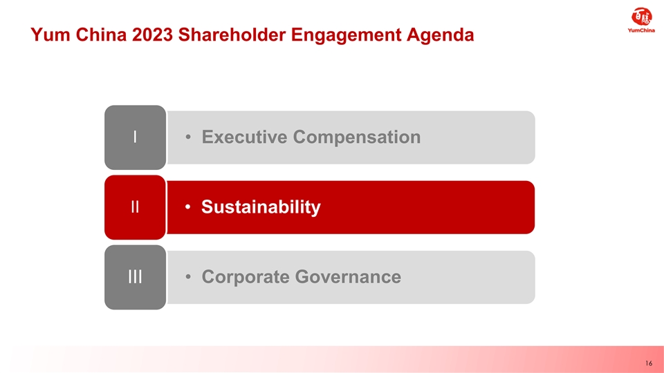 Yum China 2023 Shareholder Engagement Agenda I • Executive Compensation II • Sustainability III • Corporate Governance 16