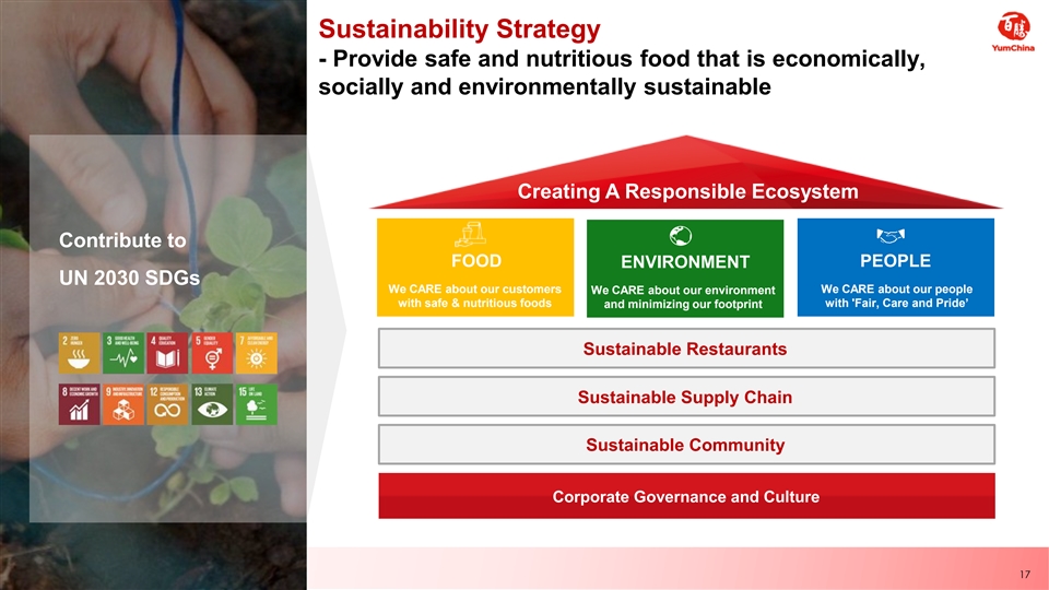 Sustainability Strategy - Provide safe and nutritious food that is economically, socially and environmentally sustainable Creating A Responsible Ecosystem Contribute to FOOD PEOPLE ENVIRONMENT UN 2030 SDGs We CARE about our customers We CARE about our people We CARE about our environment with safe & nutritious foods with 'Fair, Care and Pride’ and minimizing our footprint Sustainable Restaurants Sustainable Supply Chain Sustainable Community Corporate Governance and Culture 17