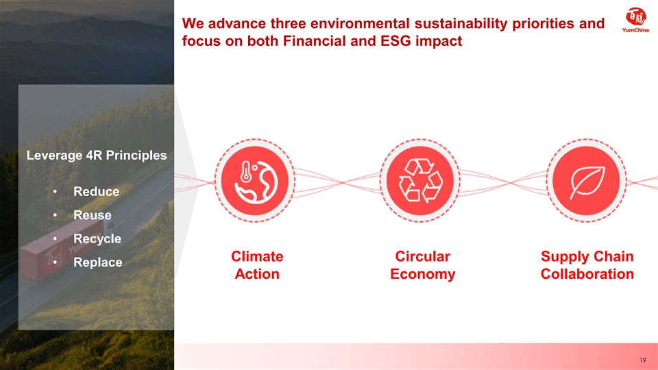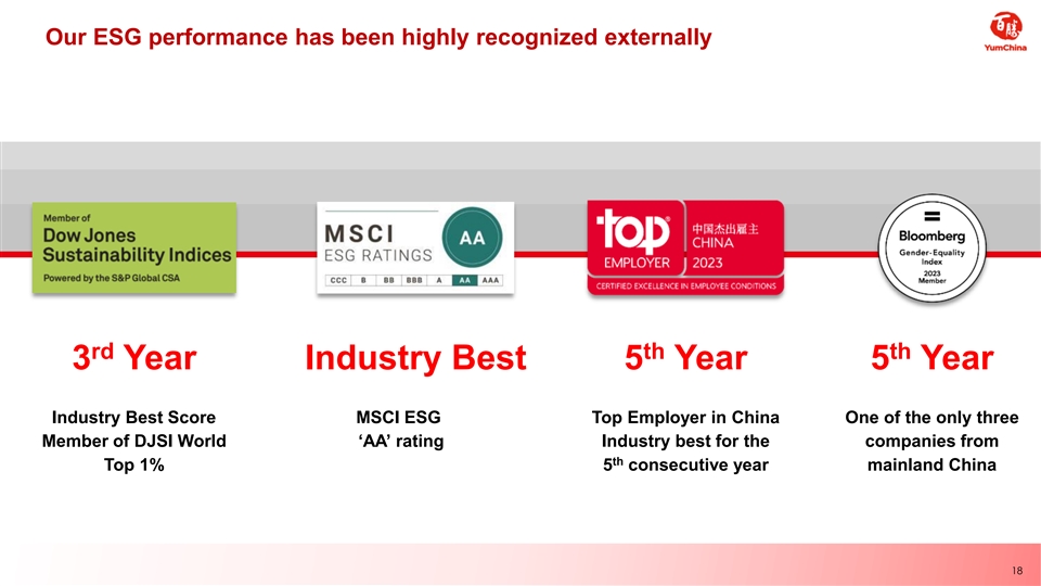 Our ESG performance has been highly recognized externally rd th th 3 Year Industry Best 5 Year 5 Year Industry Best Score MSCI ESG Top Employer in China One of the only three Member of DJSI World ‘AA’ rating Industry best for the companies from th Top 1% 5 consecutive year mainland China 18