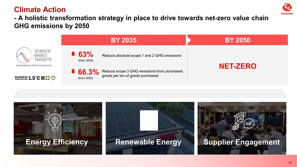 Climate Action - A holistic transformation strategy in place to drive towards net-zero value chain GHG emissions by 2050 BY 2035 BY 2050 63% Reduce absolute scope 1 and 2 GHG emissions (from 2020) NET-ZERO Reduce scope 3 GHG emissions from purchased 66.3% goods per ton of goods purchased (from 2020) 范围一/二关键行动 Energy Efficiency Renewable Energy Supplier Engagement 20