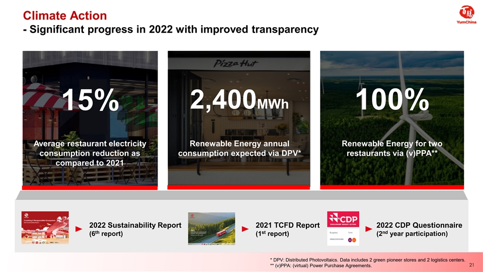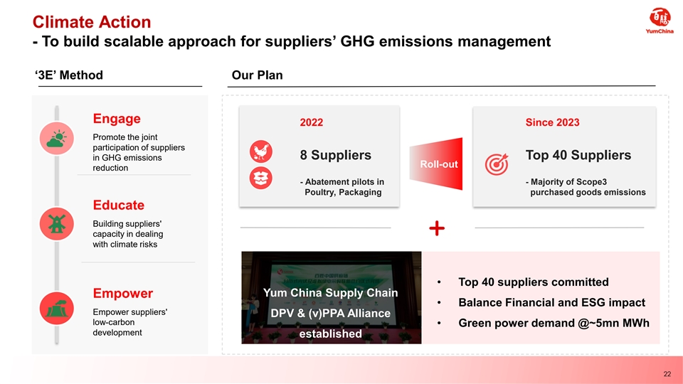 Climate Action - Significant progress in 2022 with improved transparency 2,400MWh 100% 15% Average restaurant electricity Renewable Energy annual Renewable Energy for two consumption reduction as consumption expected via DPV* restaurants via (v)PPA** compared to 2021 2022 Sustainability Report 2021 TCFD Report 2022 CDP Questionnaire th st nd (6 report) (1 report) (2 year participation) * DPV: Distributed Photovoltaics. Data includes 2 green pioneer stores and 2 logistics centers. 21 ** (v)PPA: (virtual) Power Purchase Agreements.
