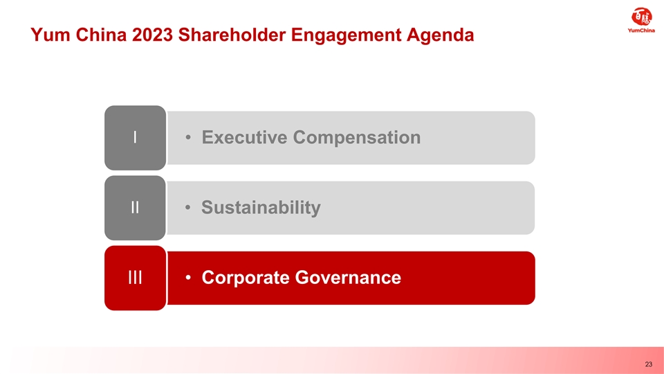 Yum China 2023 Shareholder Engagement Agenda I • Executive Compensation II • Sustainability III • Corporate Governance 23