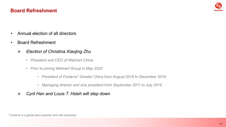 Board Refreshment • Annual election of all directors • Board Refreshment ➢ Election of Christina Xiaojing Zhu • President and CEO of Walmart China • Prior to joining Walmart Group in May 2020 • President of Fonterra* Greater China from August 2016 to December 2019 • Managing director and vice president from September 2011 to July 2016 ➢ Cyril Han and Louis T. Hsieh will step down * Fonterra is a global dairy exporter and milk processor 24