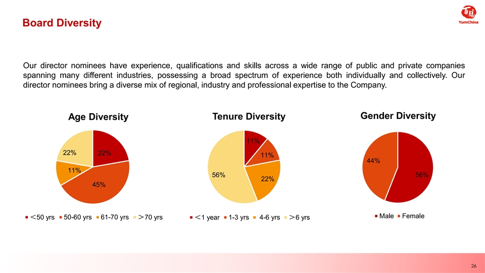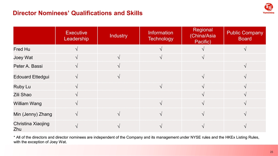 Director Nominees’ Qualifications and Skills Regional Executive Information Public Company Industry (China/Asia Leadership Technology Board Pacific) Fred Hu √ √ √ √ Joey Wat √ √ √ √ Peter A. Bassi √ √ √ Edouard Ettedgui √ √ √ √ Ruby Lu √ √ √ √ Zili Shao √ √ √ William Wang √ √ √ √ Min (Jenny) Zhang √ √ √ √ √ Christina Xiaojing √ √ √ √ √ Zhu * All of the directors and director nominees are independent of the Company and its management under NYSE rules and the HKEx Listing Rules, with the exception of Joey Wat. 25