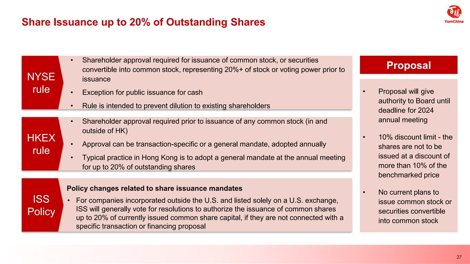 Share Issuance up to 20% of Outstanding Shares • Shareholder approval required for issuance of common stock, or securities Proposal convertible into common stock, representing 20%+ of stock or voting power prior to NYSE issuance rule • Proposal will give • Exception for public issuance for cash authority to Board until • Rule is intended to prevent dilution to existing shareholders deadline for 2024 annual meeting • Shareholder approval required prior to issuance of any common stock (in and outside of HK) • 10% discount limit - the HKEX • Approval can be transaction-specific or a general mandate, adopted annually shares are not to be rule issued at a discount of • Typical practice in Hong Kong is to adopt a general mandate at the annual meeting more than 10% of the for up to 20% of outstanding shares benchmarked price Policy changes related to share issuance mandates • No current plans to ISS • For companies incorporated outside the U.S. and listed solely on a U.S. exchange, issue common stock or ISS will generally vote for resolutions to authorize the issuance of common shares securities convertible Policy up to 20% of currently issued common share capital, if they are not connected with a into common stock specific transaction or financing proposal 27