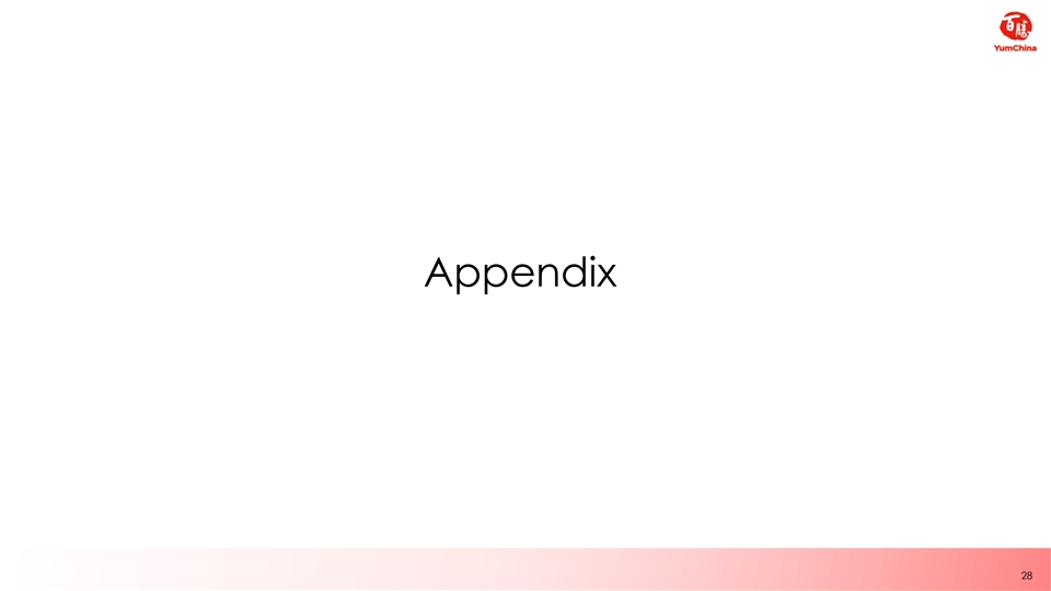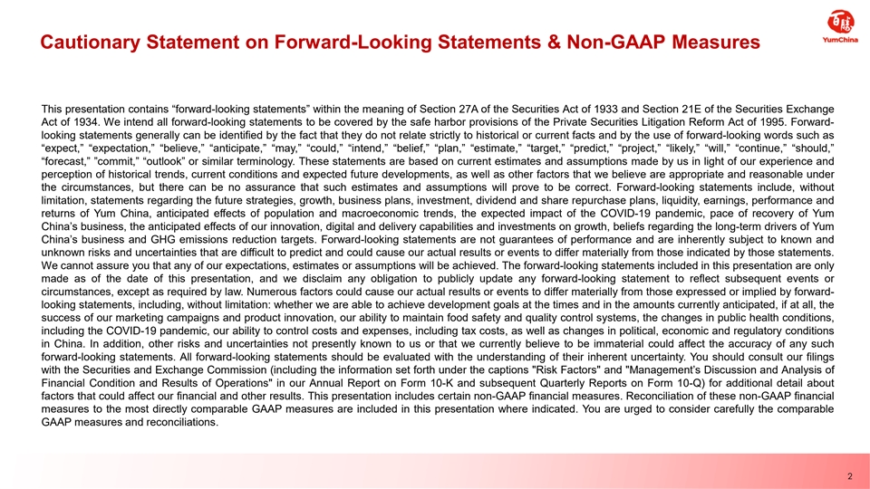 Cautionary Statement on Forward-Looking Statements & Non-GAAP Measures This presentation contains “forward-looking statements” within the meaning of Section 27A of the Securities Act of 1933 and Section 21E of the Securities Exchange Act of 1934. We intend all forward-looking statements to be covered by the safe harbor provisions of the Private Securities Litigation Reform Act of 1995. Forward- looking statements generally can be identified by the fact that they do not relate strictly to historical or current facts and by the use of forward-looking words such as “expect,” “expectation,” “believe,” “anticipate,” “may,” “could,” “intend,” “belief,” “plan,” “estimate,” “target,” “predict,” “project,” “likely,” “will,” “continue,” “should,” “forecast,” ”commit,” “outlook” or similar terminology. These statements are based on current estimates and assumptions made by us in light of our experience and perception of historical trends, current conditions and expected future developments, as well as other factors that we believe are appropriate and reasonable under the circumstances, but there can be no assurance that such estimates and assumptions will prove to be correct. Forward-looking statements include, without limitation, statements regarding the future strategies, growth, business plans, investment, dividend and share repurchase plans, liquidity, earnings, performance and returns of Yum China, anticipated effects of population and macroeconomic trends, the expected impact of the COVID-19 pandemic, pace of recovery of Yum China’s business, the anticipated effects of our innovation, digital and delivery capabilities and investments on growth, beliefs regarding the long-term drivers of Yum China’s business and GHG emissions reduction targets. Forward-looking statements are not guarantees of performance and are inherently subject to known and unknown risks and uncertainties that are difficult to predict and could cause our actual results or events to differ materially from those indicated by those statements. We cannot assure you that any of our expectations, estimates or assumptions will be achieved. The forward-looking statements included in this presentation are only made as of the date of this presentation, and we disclaim any obligation to publicly update any forward-looking statement to reflect subsequent events or circumstances, except as required by law. Numerous factors could cause our actual results or events to differ materially from those expressed or implied by forward- looking statements, including, without limitation: whether we are able to achieve development goals at the times and in the amounts currently anticipated, if at all, the success of our marketing campaigns and product innovation, our ability to maintain food safety and quality control systems, the changes in public health conditions, including the COVID-19 pandemic, our ability to control costs and expenses, including tax costs, as well as changes in political, economic and regulatory conditions in China. In addition, other risks and uncertainties not presently known to us or that we currently believe to be immaterial could affect the accuracy of any such forward-looking statements. All forward-looking statements should be evaluated with the understanding of their inherent uncertainty. You should consult our filings with the Securities and Exchange Commission (including the information set forth under the captions Risk Factors and Management’s Discussion and Analysis of Financial Condition and Results of Operations in our Annual Report on Form 10-K and subsequent Quarterly Reports on Form 10-Q) for additional detail about factors that could affect our financial and other results. This presentation includes certain non-GAAP financial measures. Reconciliation of these non-GAAP financial measures to the most directly comparable GAAP measures are included in this presentation where indicated. You are urged to consider carefully the comparable GAAP measures and reconciliations. 2