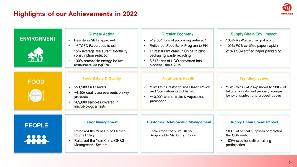 Highlights of our Achievements in 2022 Climate Action Circular Economy Supply Chain Env. Impact ENVIRONMENT • Near-term SBTs approved • ~19,000 tons of packaging reduced* • 100% RSPO-certified palm oil st • 1 TCFD Report published • Rolled out Food Bank Program to PH • 100% FCS-certified paper napkin st • 15% average restaurant electricity • 1 restaurant chain in China to pilot • 21% FSC-certified paper packaging consumption reduction packaging waste recycling • 100% renewable energy for two • 3,518 tons of UCO converted into restaurants via (v)PPA biodiesel since 2019 Food Safety & Quality Nutrition & Health Trending Issues FOOD • >21,200 OEC Audits • Yum China Nutrition and Health Policy • Yum China GAP expanded to 100% of and Commitments published lettuce, tomato and pepper, oranges, • ~4,500 quality assessments on key lemons, apples, and broccoli bases products • ~40,000 tons of fruits & vegetables purchased • >89,000 samples covered in microbiological tests Labor Management Customer Relationship Management Supply Chain Social Impact PEOPLE • Released the Yum China Human • Formulated the Yum China • 100% of critical suppliers completed Rights Policy Responsible Marketing Policy the CSR audit • Released the Yum China OH&S • 100% supplier online training Management System participation 29