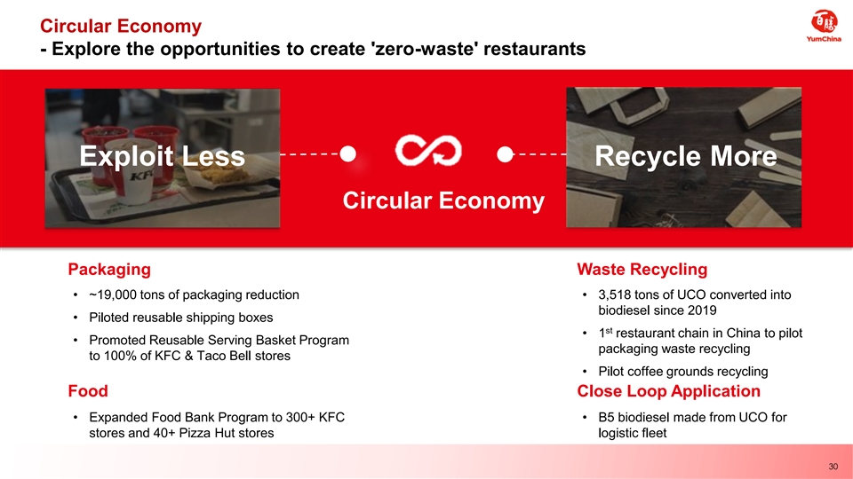 Circular Economy - Explore the opportunities to create 'zero-waste' restaurants Exploit Less Recycle More Circular Economy Packaging Waste Recycling • ~19,000 tons of packaging reduction • 3,518 tons of UCO converted into biodiesel since 2019 • Piloted reusable shipping boxes st • 1 restaurant chain in China to pilot • Promoted Reusable Serving Basket Program packaging waste recycling to 100% of KFC & Taco Bell stores • Pilot coffee grounds recycling Food Close Loop Application • Expanded Food Bank Program to 300+ KFC • B5 biodiesel made from UCO for stores and 40+ Pizza Hut stores logistic fleet 30