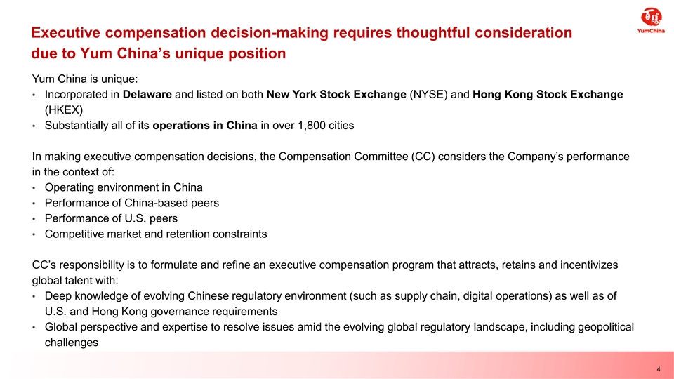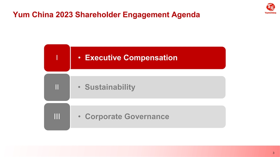 Yum China 2023 Shareholder Engagement Agenda I • Executive Compensation II • Sustainability III • Corporate Governance 3