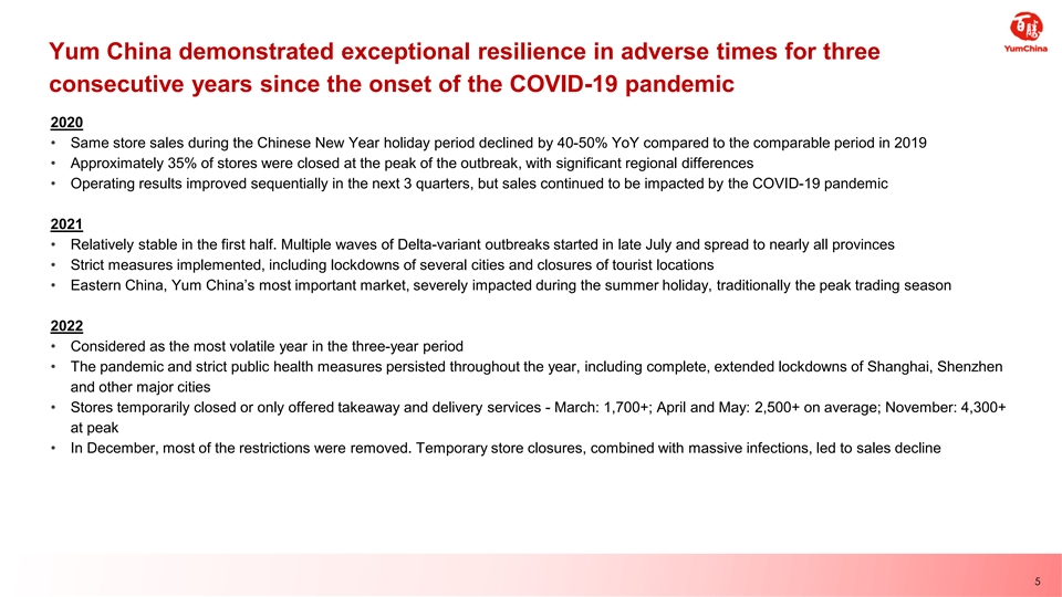 Yum China demonstrated exceptional resilience in adverse times for three consecutive years since the onset of the COVID-19 pandemic 2020 • Same store sales during the Chinese New Year holiday period declined by 40-50% YoY compared to the comparable period in 2019 • Approximately 35% of stores were closed at the peak of the outbreak, with significant regional differences • Operating results improved sequentially in the next 3 quarters, but sales continued to be impacted by the COVID-19 pandemic 2021 • Relatively stable in the first half. Multiple waves of Delta-variant outbreaks started in late July and spread to nearly all provinces • Strict measures implemented, including lockdowns of several cities and closures of tourist locations • Eastern China, Yum China’s most important market, severely impacted during the summer holiday, traditionally the peak trading season 2022 • Considered as the most volatile year in the three-year period • The pandemic and strict public health measures persisted throughout the year, including complete, extended lockdowns of Shanghai, Shenzhen and other major cities • Stores temporarily closed or only offered takeaway and delivery services - March: 1,700+; April and May: 2,500+ on average; November: 4,300+ at peak • In December, most of the restrictions were removed. Temporary store closures, combined with massive infections, led to sales decline 5
