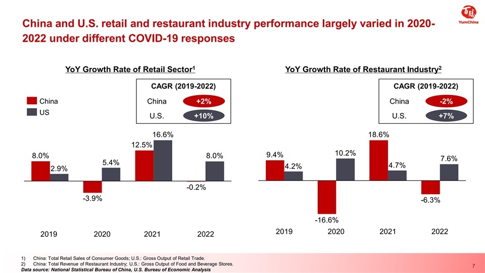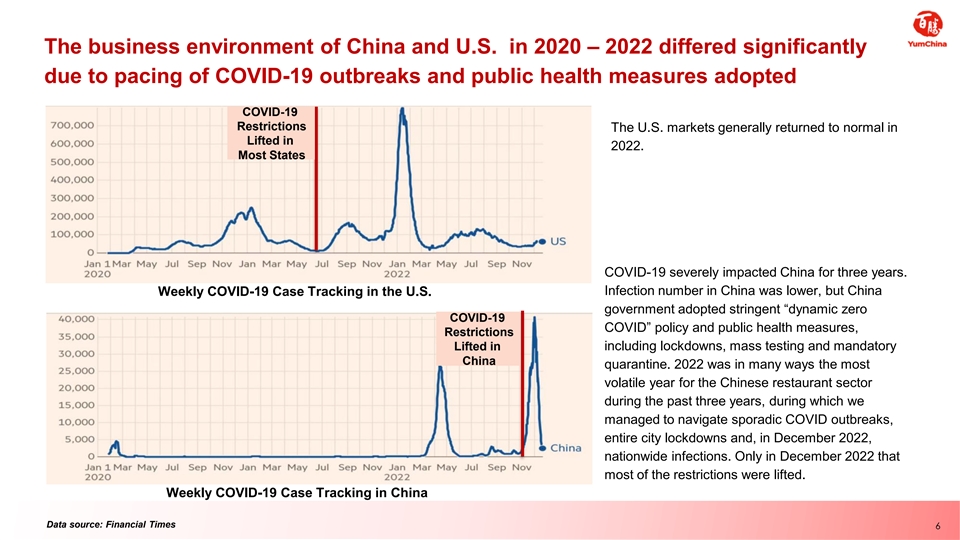 The business environment of China and U.S. in 2020 – 2022 differed significantly due to pacing of COVID-19 outbreaks and public health measures adopted COVID-19 Restrictions The U.S. markets generally returned to normal in Lifted in 2022. Most States COVID-19 severely impacted China for three years. Infection number in China was lower, but China Weekly COVID-19 Case Tracking in the U.S. government adopted stringent “dynamic zero COVID-19 COVID” policy and public health measures, Restrictions Lifted in including lockdowns, mass testing and mandatory China quarantine. 2022 was in many ways the most volatile year for the Chinese restaurant sector during the past three years, during which we managed to navigate sporadic COVID outbreaks, entire city lockdowns and, in December 2022, nationwide infections. Only in December 2022 that most of the restrictions were lifted. Weekly COVID-19 Case Tracking in China Data source: Financial Times 6