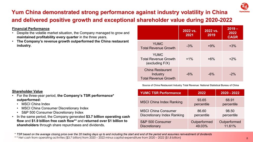 China and U.S. retail and restaurant industry performance largely varied in 2020- 2022 under different COVID-19 responses 1 2 YoY Growth Rate of Retail Sector YoY Growth Rate of Restaurant Industry CAGR (2019-2022) CAGR (2019-2022) China China +2% China -2% US U.S. +10% U.S. +7% 16.6% 18.6% 12.5% 10.2% 9.4% 8.0% 8.0% 7.6% 5.4% 4.7% 4.2% 2.9% -0.2% -3.9% -6.3% -16.6% 2019 2020 2021 2022 2019 2020 2021 2022 1) China: Total Retail Sales of Consumer Goods; U.S.: Gross Output of Retail Trade. 2) China: Total Revenue of Restaurant Industry; U.S.: Gross Output of Food and Beverage Stores. 7 Data source: National Statistical Bureau of China, U.S. Bureau of Economic Analysis