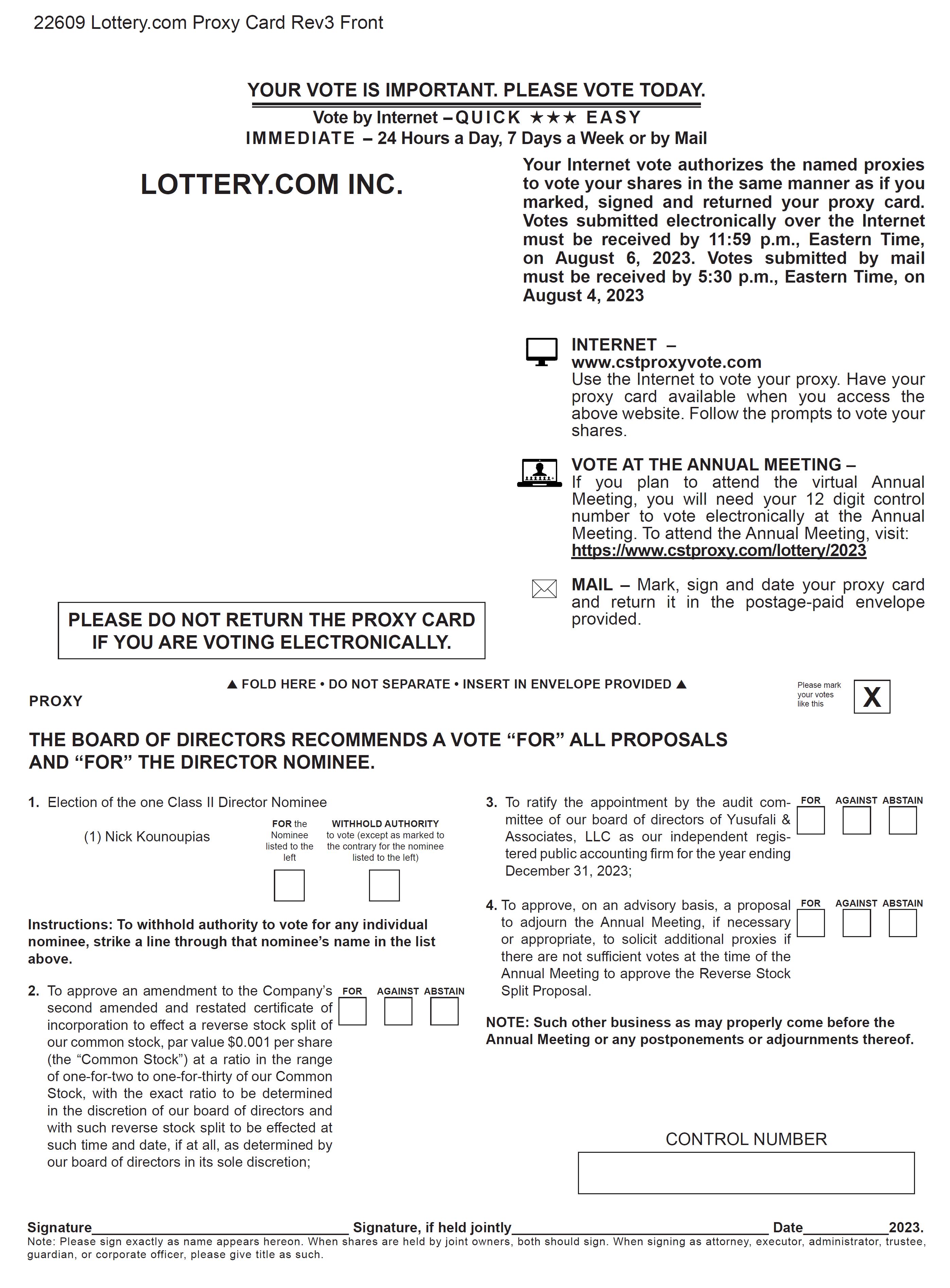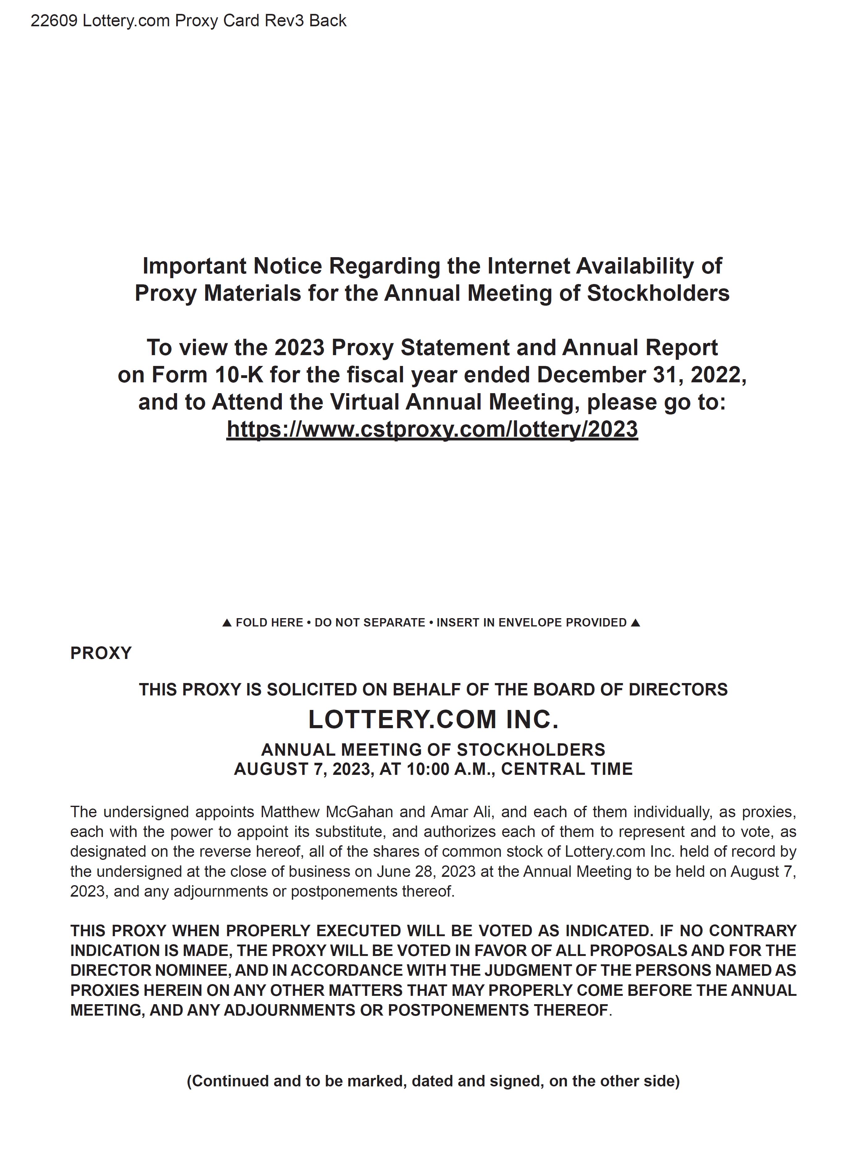 You are cordially invited to attend the 2023 Annual Meeting of Stockholders (the “Annual Meeting”) of Lottery.com Inc., a Delaware corporation (the “Company”). The meeting will be held on August 7, 2023 at 10 a.m. Central Time. The Annual Meeting will be a virtual meeting of stockholders, which will be conducted only via a live audio webcast. You will be able to attend the Annual Meeting, submit your questions and vote online during the meeting by visiting https://www.cstproxy.com/lottery/2023. To participate in the Annual Meeting, you will need to register to attend the meeting by 5:30 p.m., Eastern time, on August 2, 2023 using the control number located on your proxy card or voting instruction form. For purposes of attendance at the Annual Meeting, all references in the accompanying Proxy Statement to “present in person” or “in person” shall mean virtually present at the Annual Meeting.