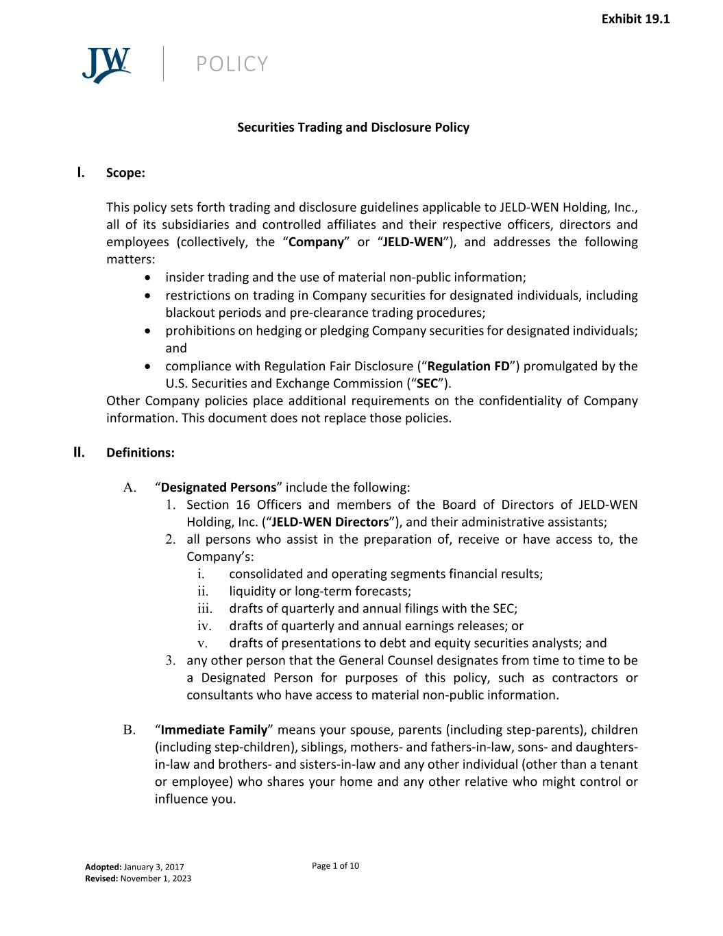 POLICY Adopted: January 3, 2017 Revised: November 1, 2023 Page 1 of 10 Securities Trading and Disclosure Policy I. Scope: This policy sets forth trading and disclosure guidelines applicable to JELD-WEN Holding, Inc., all of its subsidiaries and controlled affiliates and their respective officers, directors and employees (collectively, the “Company” or “JELD-WEN”), and addresses the following matters: • insider trading and the use of material non-public information; • restrictions on trading in Company securities for designated individuals, including blackout periods and pre-clearance trading procedures; • prohibitions on hedging or pledging Company securities for designated individuals; and • compliance with Regulation Fair Disclosure (“Regulation FD”) promulgated by the U.S. Securities and Exchange Commission (“SEC”). Other Company policies place additional requirements on the confidentiality of Company information. This document does not replace those policies. II. Definitions: A. “Designated Persons” include the following: 1. Section 16 Officers and members of the Board of Directors of JELD-WEN Holding, Inc. (“JELD-WEN Directors”), and their administrative assistants; 2. all persons who assist in the preparation of, receive or have access to, the Company’s: i. consolidated and operating segments financial results; ii. liquidity or long-term forecasts; iii. drafts of quarterly and annual filings with the SEC; iv. drafts of quarterly and annual earnings releases; or v. drafts of presentations to debt and equity securities analysts; and 3. any other person that the General Counsel designates from time to time to be a Designated Person for purposes of this policy, such as contractors or consultants who have access to material non-public information. B. “Immediate Family” means your spouse, parents (including step-parents), children (including step-children), siblings, mothers- and fathers-in-law, sons- and daughters- in-law and brothers- and sisters-in-law and any other individual (other than a tenant or employee) who shares your home and any other relative who might control or influence you. Exhibit 19.1