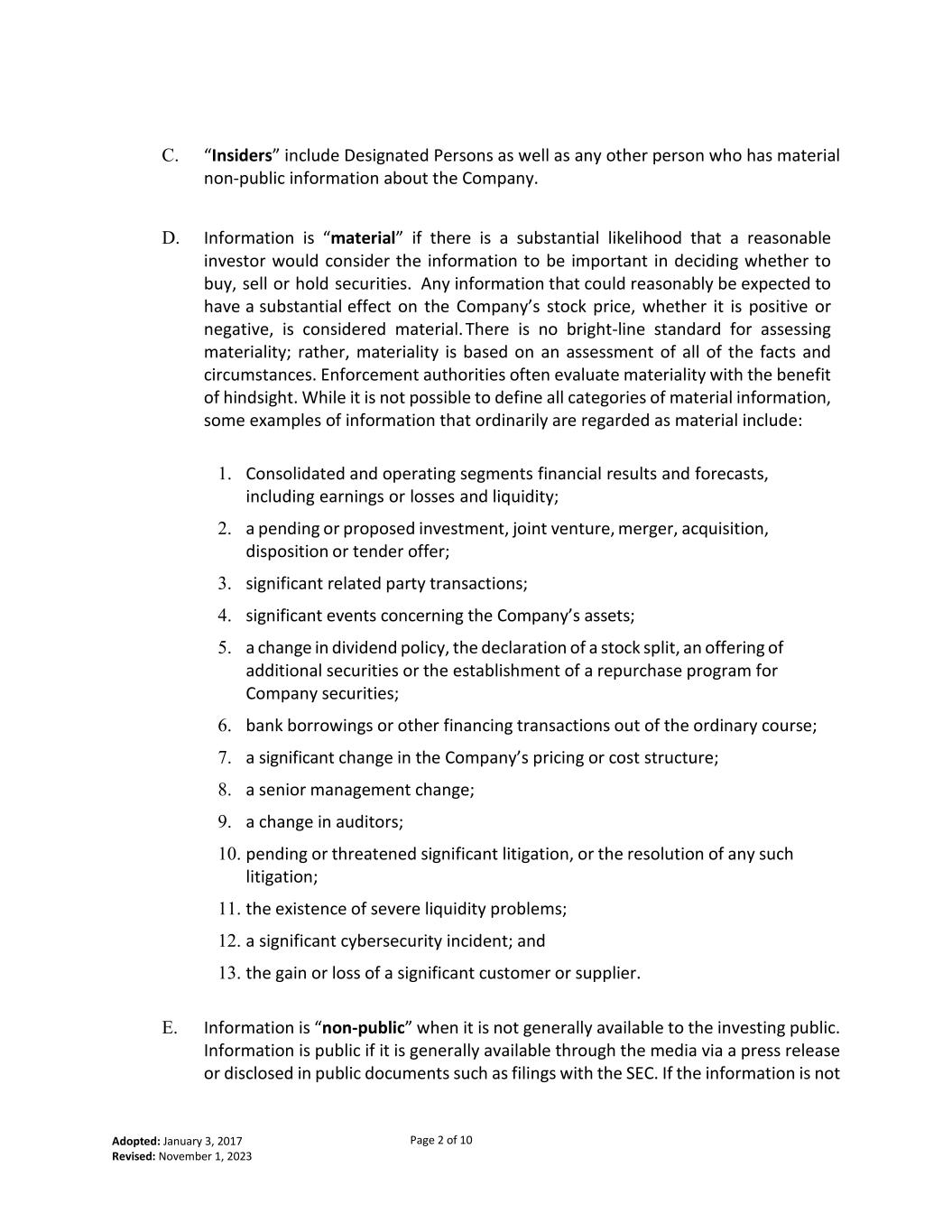 Adopted: January 3, 2017 Revised: November 1, 2023 Page 2 of 10 C. “Insiders” include Designated Persons as well as any other person who has material non-public information about the Company. D. Information is “material” if there is a substantial likelihood that a reasonable investor would consider the information to be important in deciding whether to buy, sell or hold securities. Any information that could reasonably be expected to have a substantial effect on the Company’s stock price, whether it is positive or negative, is considered material. There is no bright-line standard for assessing materiality; rather, materiality is based on an assessment of all of the facts and circumstances. Enforcement authorities often evaluate materiality with the benefit of hindsight. While it is not possible to define all categories of material information, some examples of information that ordinarily are regarded as material include: 1. Consolidated and operating segments financial results and forecasts, including earnings or losses and liquidity; 2. a pending or proposed investment, joint venture, merger, acquisition, disposition or tender offer; 3. significant related party transactions; 4. significant events concerning the Company’s assets; 5. a change in dividend policy, the declaration of a stock split, an offering of additional securities or the establishment of a repurchase program for Company securities; 6. bank borrowings or other financing transactions out of the ordinary course; 7. a significant change in the Company’s pricing or cost structure; 8. a senior management change; 9. a change in auditors; 10. pending or threatened significant litigation, or the resolution of any such litigation; 11. the existence of severe liquidity problems; 12. a significant cybersecurity incident; and 13. the gain or loss of a significant customer or supplier. E. Information is “non-public” when it is not generally available to the investing public. Information is public if it is generally available through the media via a press release or disclosed in public documents such as filings with the SEC. If the information is not