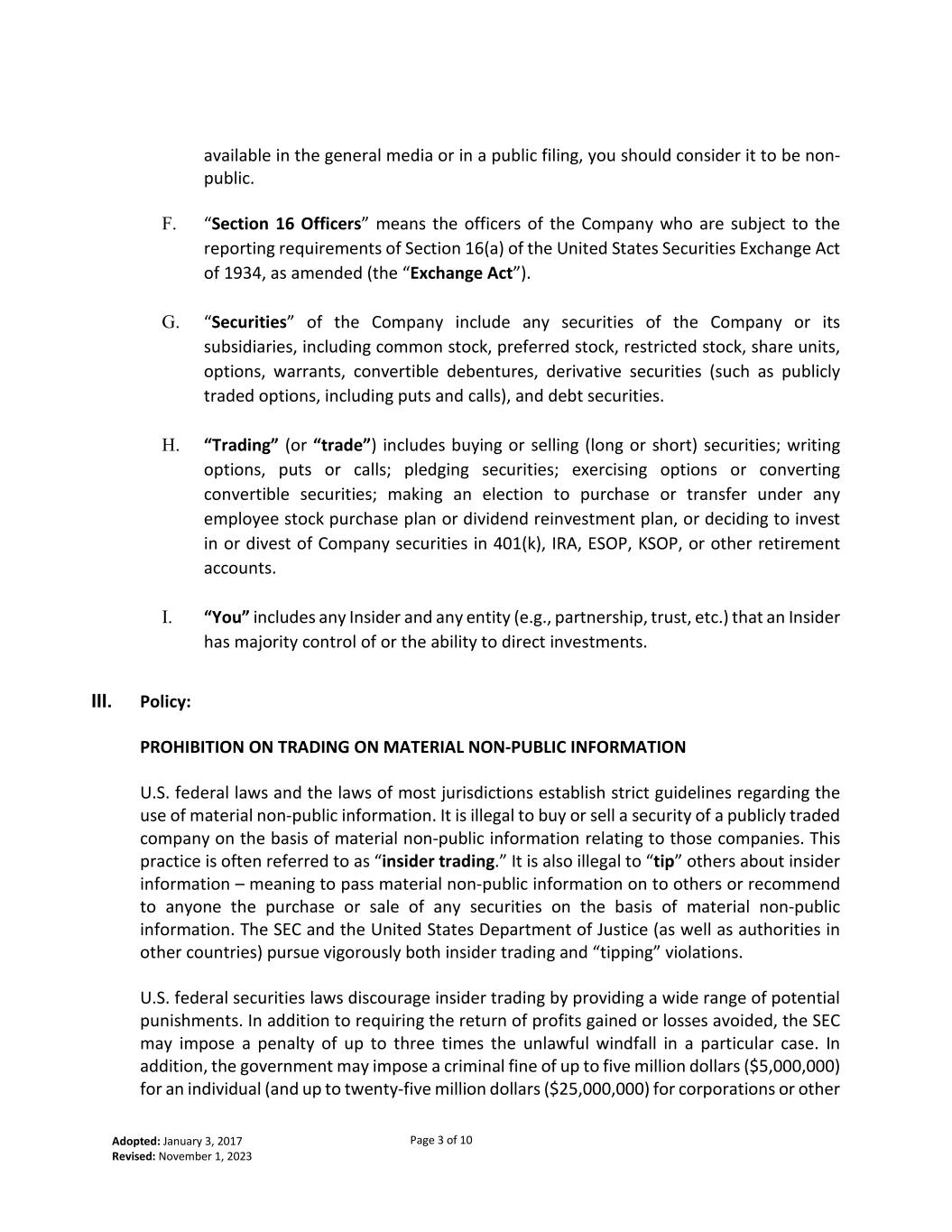 Adopted: January 3, 2017 Revised: November 1, 2023 Page 3 of 10 available in the general media or in a public filing, you should consider it to be non- public. F. “Section 16 Officers” means the officers of the Company who are subject to the reporting requirements of Section 16(a) of the United States Securities Exchange Act of 1934, as amended (the “Exchange Act”). G. “Securities” of the Company include any securities of the Company or its subsidiaries, including common stock, preferred stock, restricted stock, share units, options, warrants, convertible debentures, derivative securities (such as publicly traded options, including puts and calls), and debt securities. H. “Trading” (or “trade”) includes buying or selling (long or short) securities; writing options, puts or calls; pledging securities; exercising options or converting convertible securities; making an election to purchase or transfer under any employee stock purchase plan or dividend reinvestment plan, or deciding to invest in or divest of Company securities in 401(k), IRA, ESOP, KSOP, or other retirement accounts. I. “You” includes any Insider and any entity (e.g., partnership, trust, etc.) that an Insider has majority control of or the ability to direct investments. III. Policy: PROHIBITION ON TRADING ON MATERIAL NON-PUBLIC INFORMATION U.S. federal laws and the laws of most jurisdictions establish strict guidelines regarding the use of material non-public information. It is illegal to buy or sell a security of a publicly traded company on the basis of material non-public information relating to those companies. This practice is often referred to as “insider trading.” It is also illegal to “tip” others about insider information – meaning to pass material non-public information on to others or recommend to anyone the purchase or sale of any securities on the basis of material non-public information. The SEC and the United States Department of Justice (as well as authorities in other countries) pursue vigorously both insider trading and “tipping” violations. U.S. federal securities laws discourage insider trading by providing a wide range of potential punishments. In addition to requiring the return of profits gained or losses avoided, the SEC may impose a penalty of up to three times the unlawful windfall in a particular case. In addition, the government may impose a criminal fine of up to five million dollars ($5,000,000) for an individual (and up to twenty-five million dollars ($25,000,000) for corporations or other