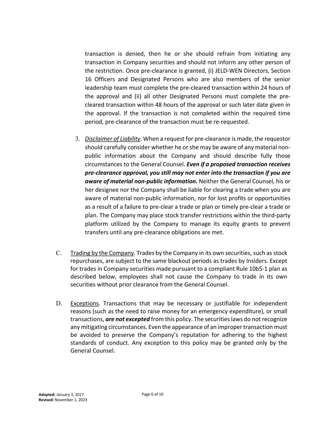 Adopted: January 3, 2017 Revised: November 1, 2023 Page 6 of 10 transaction is denied, then he or she should refrain from initiating any transaction in Company securities and should not inform any other person of the restriction. Once pre-clearance is granted, (i) JELD-WEN Directors, Section 16 Officers and Designated Persons who are also members of the senior leadership team must complete the pre-cleared transaction within 24 hours of the approval and (ii) all other Designated Persons must complete the pre- cleared transaction within 48 hours of the approval or such later date given in the approval. If the transaction is not completed within the required time period, pre-clearance of the transaction must be re-requested. 3. Disclaimer of Liability. When a request for pre-clearance is made, the requestor should carefully consider whether he or she may be aware of any material non- public information about the Company and should describe fully those circumstances to the General Counsel. Even if a proposed transaction receives pre-clearance approval, you still may not enter into the transaction if you are aware of material non-public information. Neither the General Counsel, his or her designee nor the Company shall be liable for clearing a trade when you are aware of material non-public information, nor for lost profits or opportunities as a result of a failure to pre-clear a trade or plan or timely pre-clear a trade or plan. The Company may place stock transfer restrictions within the third-party platform utilized by the Company to manage its equity grants to prevent transfers until any pre-clearance obligations are met. C. Trading by the Company. Trades by the Company in its own securities, such as stock repurchases, are subject to the same blackout periods as trades by Insiders. Except for trades in Company securities made pursuant to a compliant Rule 10b5-1 plan as described below, employees shall not cause the Company to trade in its own securities without prior clearance from the General Counsel. D. Exceptions. Transactions that may be necessary or justifiable for independent reasons (such as the need to raise money for an emergency expenditure), or small transactions, are not excepted from this policy. The securities laws do not recognize any mitigating circumstances. Even the appearance of an improper transaction must be avoided to preserve the Company’s reputation for adhering to the highest standards of conduct. Any exception to this policy may be granted only by the General Counsel.